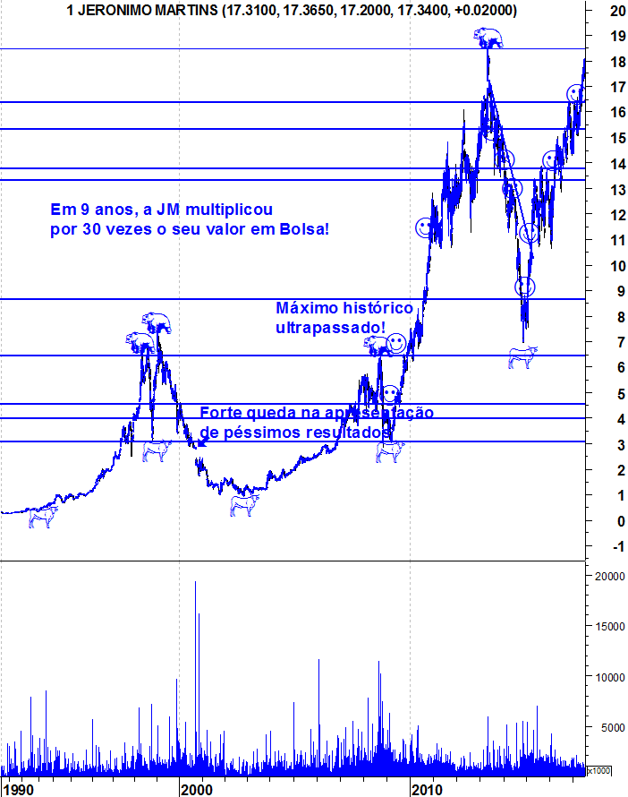 Rango Escreveu:Atenção a estas quedas e ao volume de negócios que as acompanham. Da última vez que a JMartins cotou acima dos 18€, começou a cair por aí abaixo e só parou em valores próximos dos 7€. Não quero dizer que aconteça o mesmo, mas não estou a gostar destas quedas acompanhadas com volume apreciável. Também estou fora... saí a 15,5 com preço médio de cerca de 10€... e só voltarei a entrar acima dos 19€ se ela subir, ou por volta dos 10€ se ela entretanto cair.