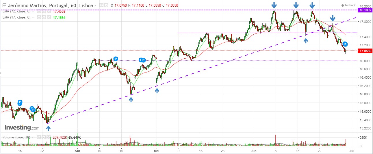 A JM está claramente em bull (vidé graficos Diario e Semanal do Ulisses) e esta correcção pode ser de facto um bom momento de entrada/reforço. Todavia só pondero entrar se der sinais de reversão no gráfico de 1 Hora onde pelas regras básicas da AT está em queda desde dia 20/junho: após 3 tentativas falhadas de rompimento do máximo histórico, quebrou em baixa a LTA, fez reteste (falhando a tentativa de rompimento em alta), tem vindo a fazer topos e fundos descendentes e o preço está abaixo das médias (de curto e longo prazo, do gráfico de 1H, obviamente). É preciso ser paciente e esperar um sinal de reversão de curto prazo já que no longo prazo é das acções mais bull do PSI.