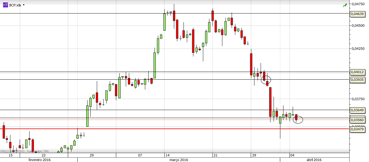 Vê o volume compara com as descidas ... bcp fez máximo 0.0479 tendo entrado em sobre compra com volume a decrescer nessa zona ... depois daí foi a cair com volume crescente até os 0.04 daí para baixo o volume tem vindo a diminuir não só pela expectativa em torno do que irá sair do bpi bem como a nível de indicadores como já disse nos quais utilizo rsi 14 e stostastico em sobre venda ... têm mais espaço para cair tAlves tenha mas para mim acho que vai aguentar aqui e poderá ter feito a correcção da última subida para voltar a subir ... abraço
