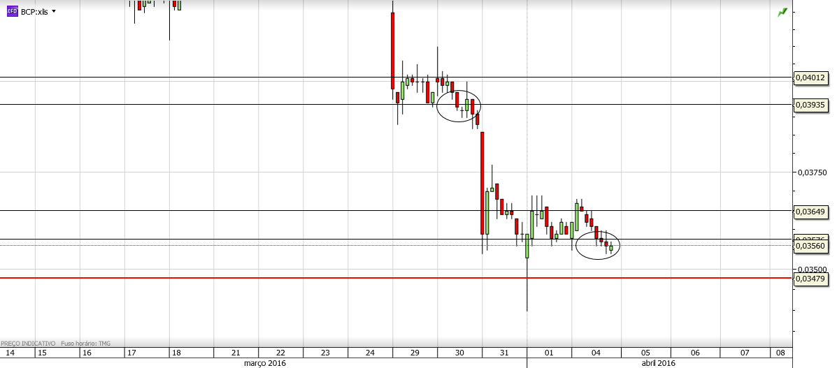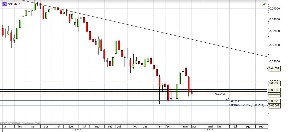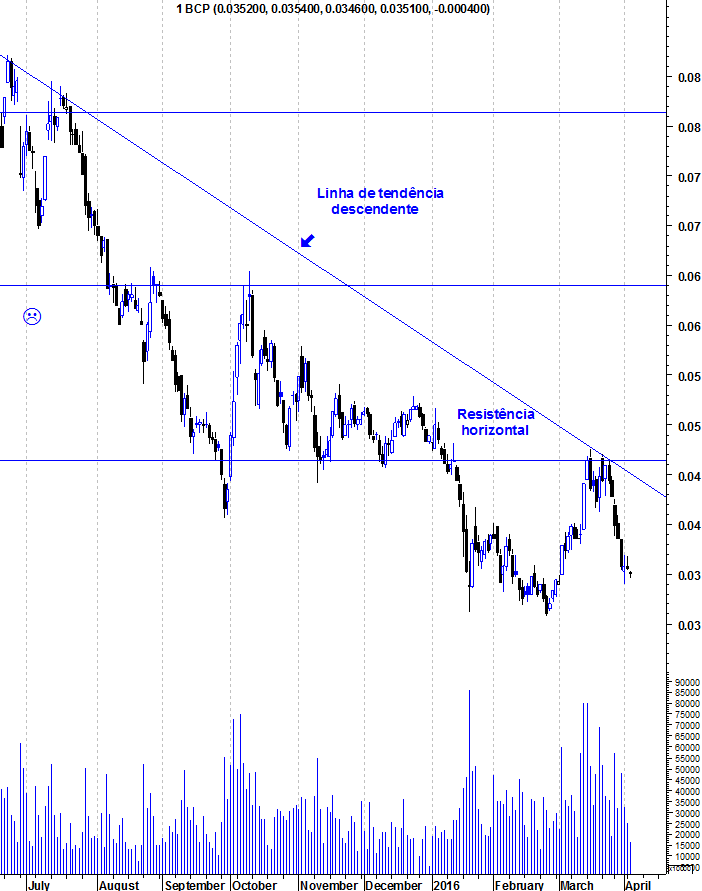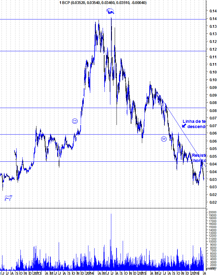 Tecnicamente, nada de novo no BCP. Tal como tenho referido, os ursos dominam enquanto os touros não conseguirem quebrar a LT descendente e a resistência horizontal.