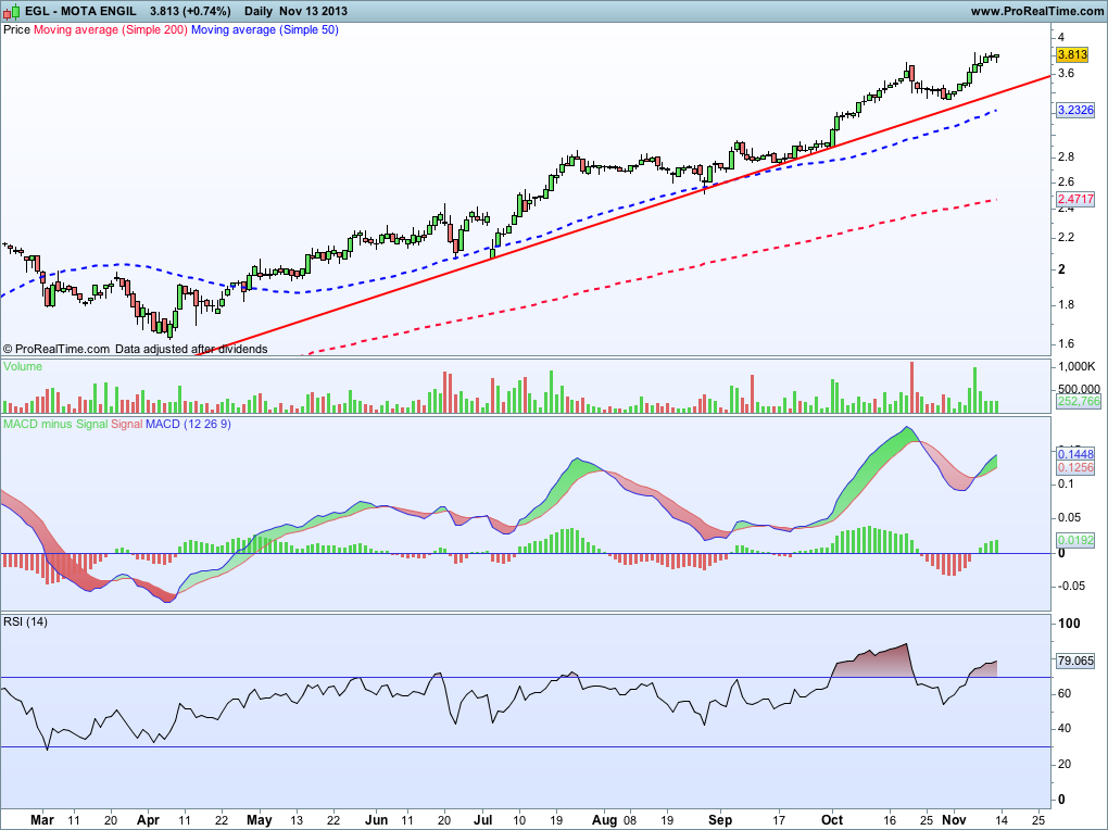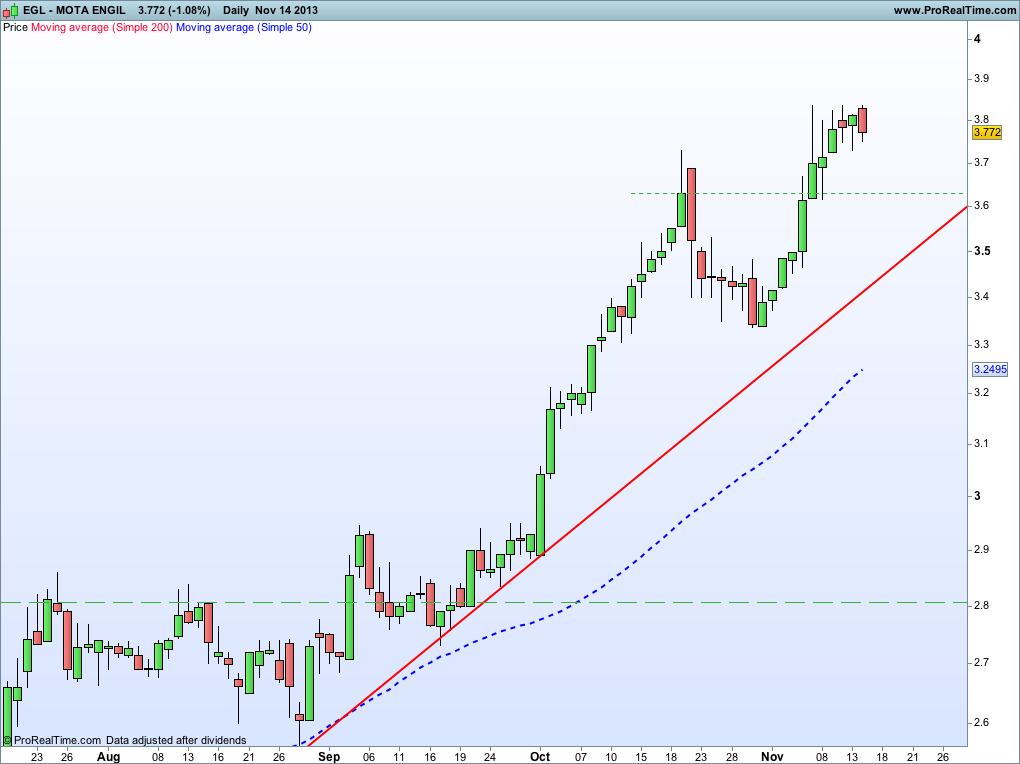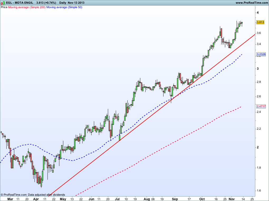 A mim parece-me que a Mota está de muito boa saúde. Também me parece que os 3,70€ (mais coisa menos coisa) se estão a mostrar como suporte no curto prazo. Deixo um gráfico onde traço uma LTa de médio prazo, a qual me serve de suporte para perceber até onde poderá descer no médio prazo em caso de correcção.
