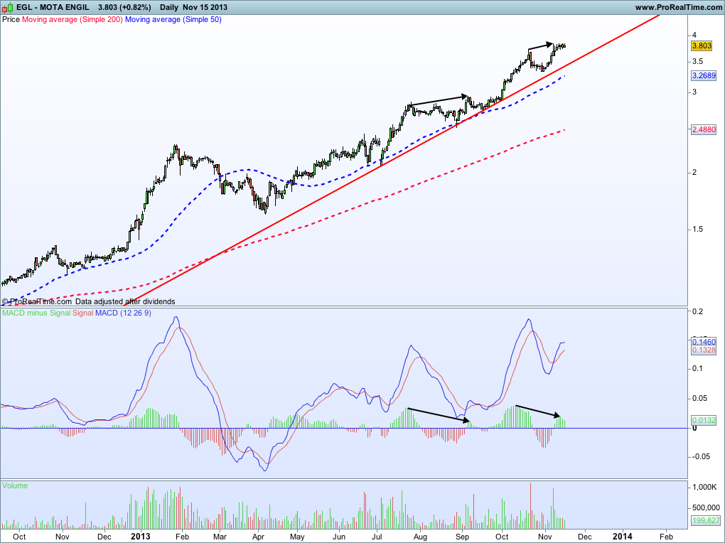 P.S: tenho ainda a perfeita noção de que é precoce estar a identificar a última divergência negativa que identifiquei no último gráfico uma vez que a Mota ainda não fez um novo máximo e o MACD ainda não cruzou. Talvez me tenha antecipado demasiado