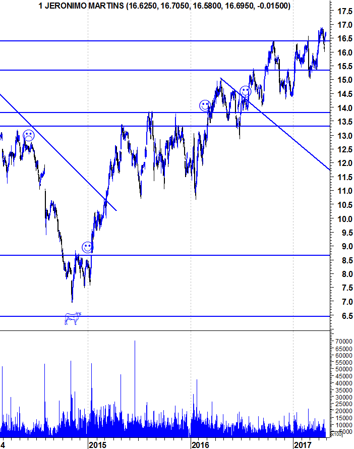 E o "Bull Market" da Jerónimo Martins que já leva 2 anos e meio continua. Nem a queda natural com o dividendo, impediu a acção de continuar o seu caminho. Continua irrepreensível em todos os horizontes temporais e mantenho o fato de touro vestido que já trago na pele há muito tempo.