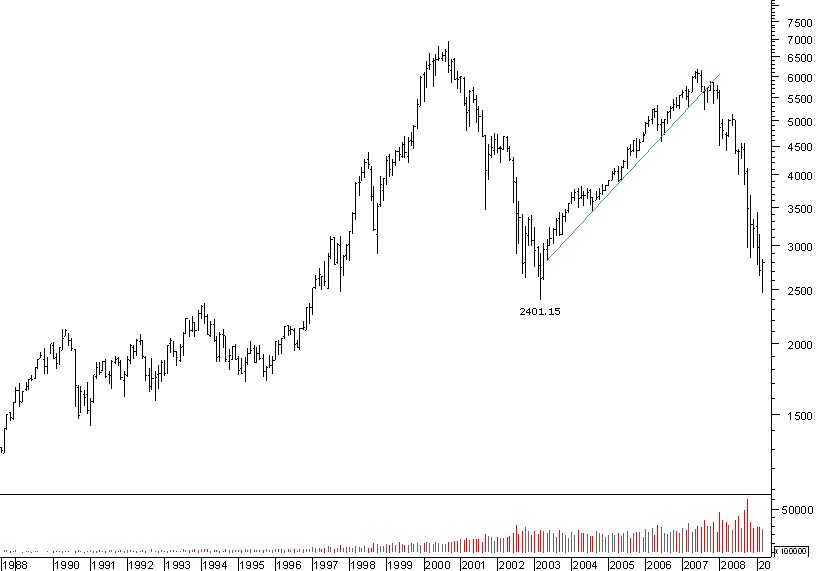Só queria informar que o proximo suporte se encontra nos 2401.15, alcançados em 12-03-2003. Até lá é de esperar correcções, que nao sao nada mais nada menos do que +-5% abaixo do valor actual. Na proxima candle de inversao é de esperar rebound forte.
