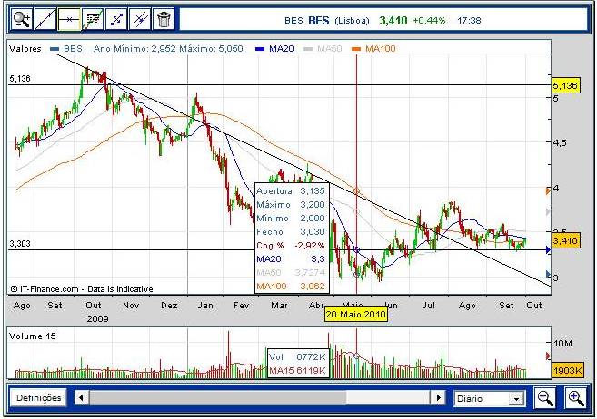 Aconselho que aguardem pela quebra em alta dos € 3,60 antes de pensarem na abertura de posições longas no BES, quando então a cotação terá um potencial de subida bem mais interessante (target projectado nos € 4,20).