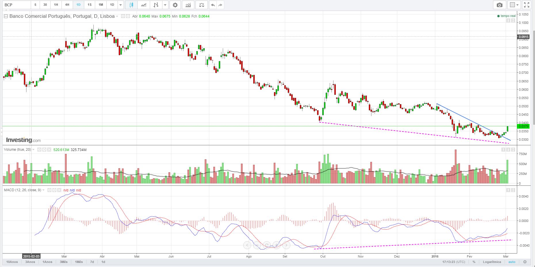 No curto prazo o BCP pode continuar neste ressalto e depois lateralizar, para construir algo consistente que indique aos investidores qual a dinâmica que o título quer assumir ( ressalto, lateral ou inicio de mudança de tendência curto/ médio prazo).