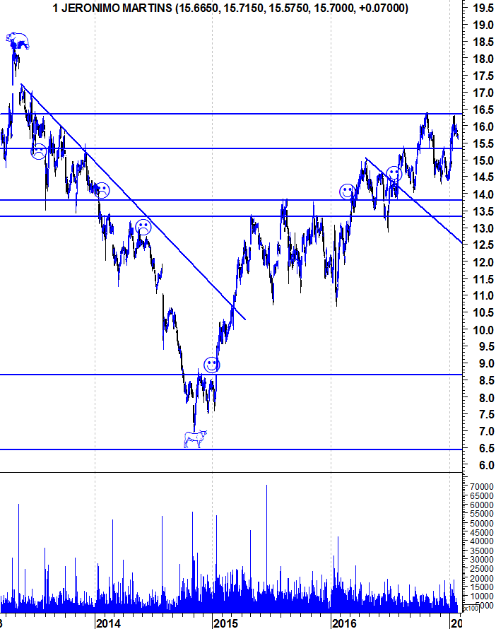 Em máximos? Só se forem os de curto-prazo, que, mesmo assim, estão por volta dos 16,4x. Os máximos de sempre da JMartins estão por volta dos 17,5 €.