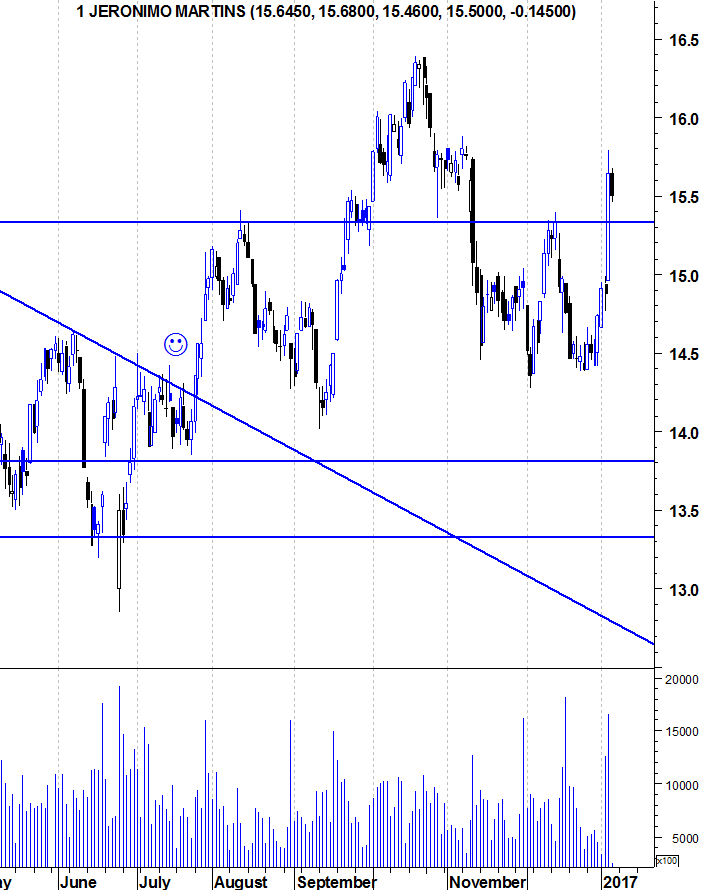 A Jerónimo Martins viveu uma sessão de fortes ganhos, beneficiando das perspectivas do JPMorgan para o último trimestre de 2016. “Forte” foi o adjectivo utilizado pelo banco para classificar os últimos três meses de 2016 da companhia.