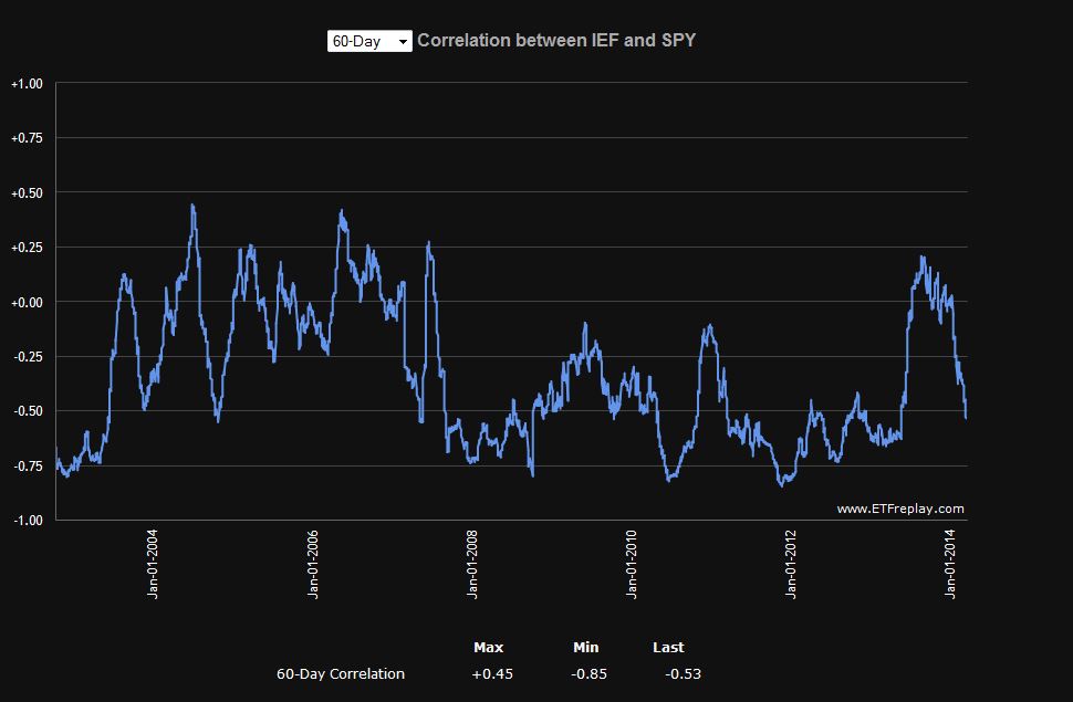 A questão é que quem escreveu o artigo se foca num período muito curto, em que as correlações foram até anormalmente negativas. Como exemplo deixo em baixo as correlações entre IEF e SPY de mais longo prazo (BLV só existe desde meados de 2007 e a diferença entre BLV e IEF é muito pouca, quase negligenciável na questão de correlações).