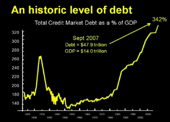 Exacto, a divida que referi é a divida do país em relação ao GDP (em %). Como tal diz respeito a todos os agentes económicos (familias, corporações, Governo, etc) que como se vê estão endividados numa proporção nunca antes vista. Na altura da Grande Depressão não se chegou a uma diferença tão desproporcionada e aconteceu o que aconteceu.
