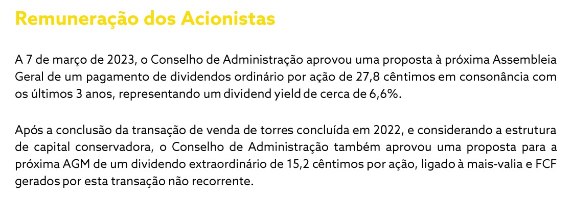 Mais um dividendo extraordinário de 15,2 cêntimos (entrega aos acionistas de cash resultante da venda das torres).