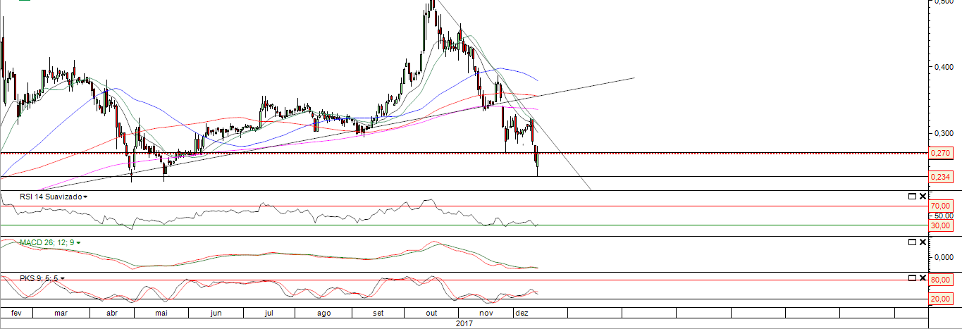 bull neste time frame que poderá levar a testar os 0.31cts e posteriormente ou não o fundo.Caso haja o rompimento deste valor em fecho, só pára acima dos 0.50cts a meu ver é claro