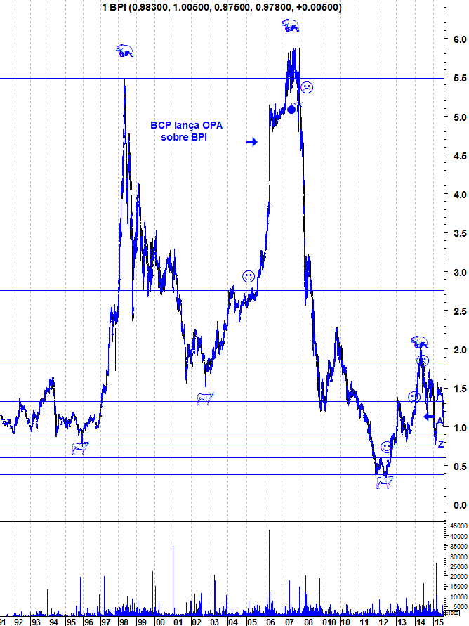 - Fazendo com que a tradicional relação 2:1 (putativamente relevante numa fusão) esteja bastante comprometida enquanto não forem atingidos cerca de 1,5 euros no BPI (mais 750M na capitalização, logo 2,250 Bi).