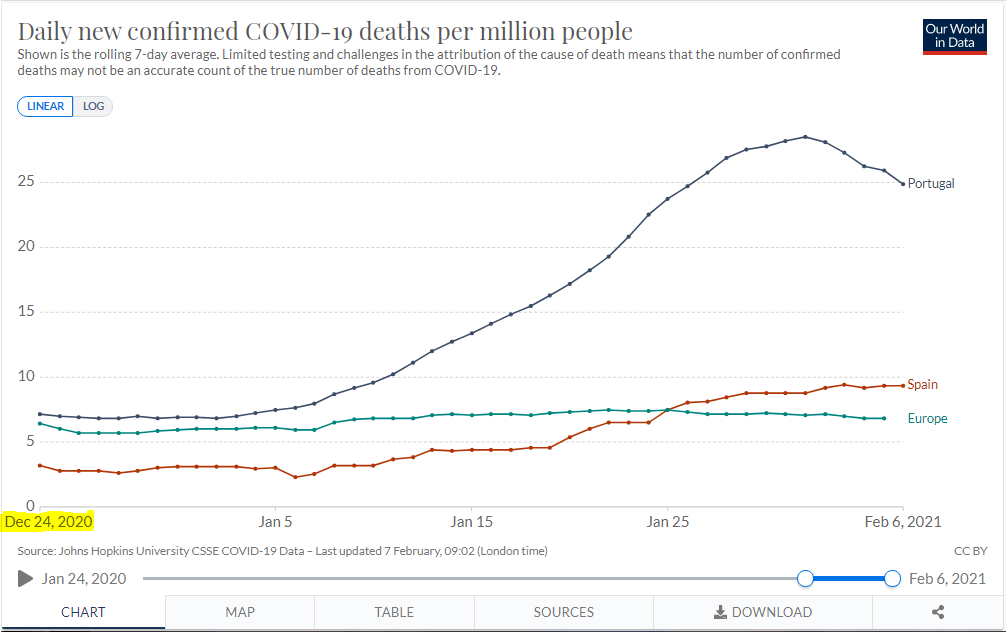 Espanha "confinou" em várias cidades muito antes de nós e com mais medidas restritivas no Natal e Portugal só "confinou" mais tarde, a partir do dia 15 de janeiro (não é comparável a março) e as escolas só fecharam mais tarde.