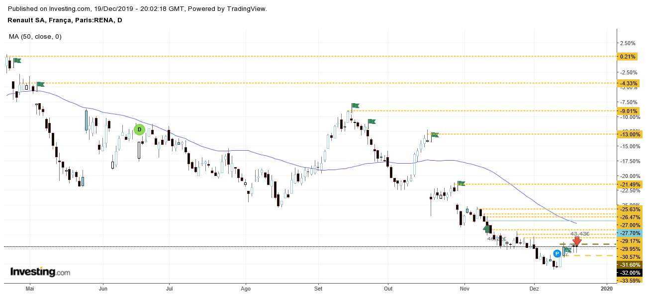 Hoje a Renault volta a fazer das suas e volta aos 40....vamos ver se se aguenta. O que me intriga é a quantidade de gaps que este gráfico apresenta... Alguém que coloque um gráfico e possa dizer onde estão os suportes e resistências, pf?