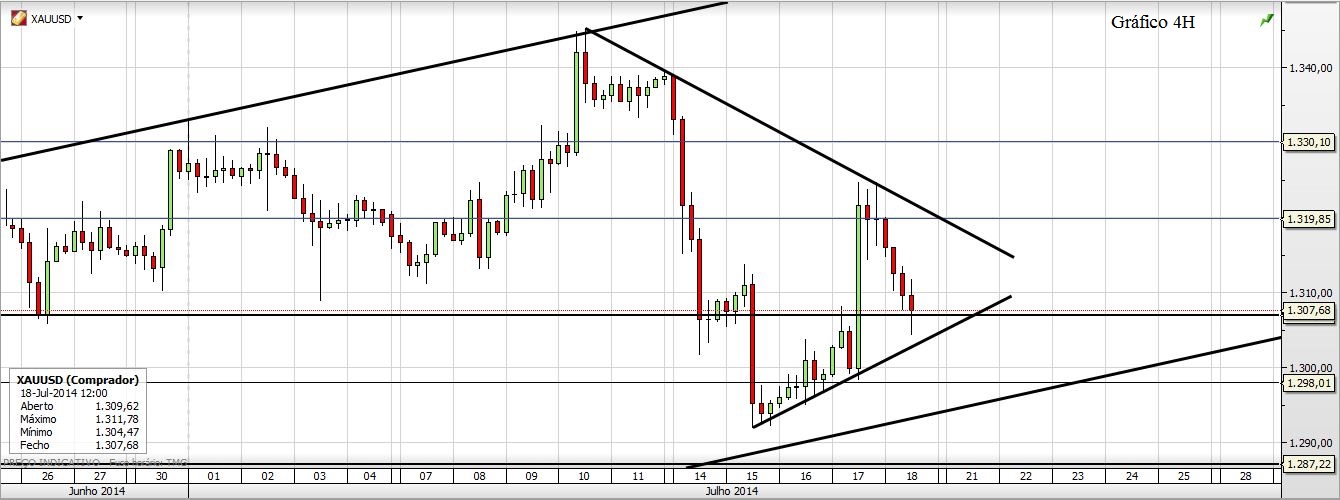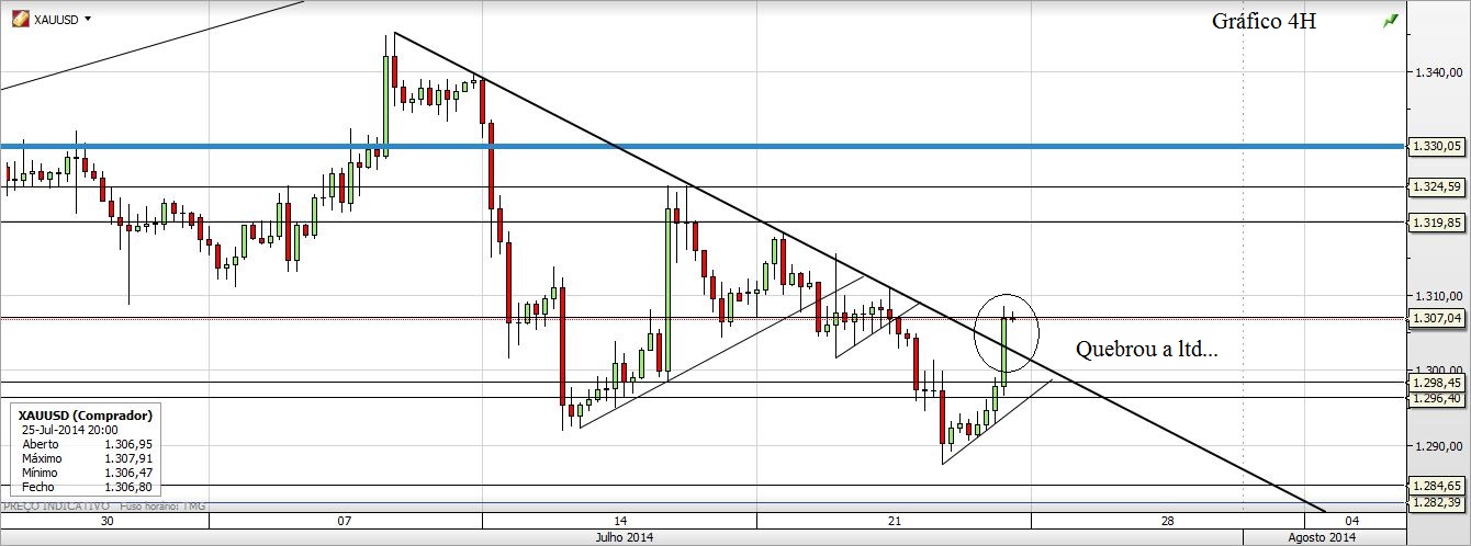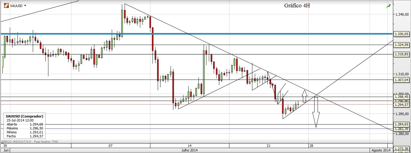 Agora deixo o que acho do Ouro. Curto ou Longo só para a semana mas acho que está mais para o lado dos curtos, quando chegar junto àquela LTA do gráfico de 4H. Até porque o canal do semanal está quebradíssimo.