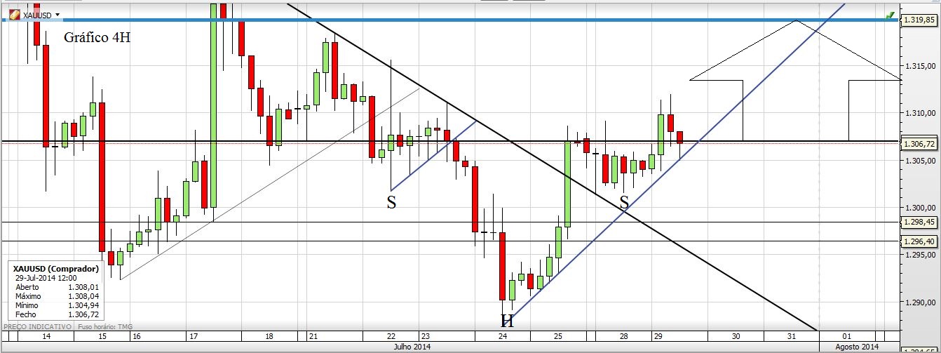Curto ou Longo só para a semana, dizia eu na Sexta (16h)... pois bem, à primeira vista parece que o lado longo está mais apetecível: Ltd do gráfico de 4 horas quebrada, o preço reentrou no canal do gráfico semanal na Sexta feira às últimas horas, quando este parecia já ter sido posto de parte, para além da vela que fez no diário... Amanhã já se vai perceber o que ele vai fazer. Eu acho que vai novamente tentar passar os 1330. Porém não esquecer que a zona dos 1307 tem sido uma forte resistência.