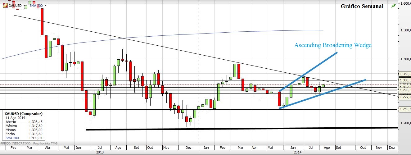 Deixo aqui a minha visão a propósito do Ouro, sendo que entrei longo ao dia de hoje depois de verificar que o preço conseguiu aguentar-se no suporte dos 1307; pela vela que fez no semanal da passada semana e por achar que no mínimo o preço tem condições para ir tocar na hipotenusa do hipotético triangulo descendente, mas também porque existe uma Ascending Broadening Wedge e que por isso poderá fazer sentido o preço ir à sua linha superior, o que atiraria a cotação para valores superiores aos 1400...?!?! É claro que existem muitas resistências para passar, mas se passa os 1330... ai será uma altura para uns reforços valentes. A Prata porém é que está a destoar mais, já que segue num canal descendente, e assim os meus impulsos para caçar perdizes mais à bruta estão mais contidos. Também pelos gráficos se pode verificar facilmente que se o Ouro não passar aquelas primeiras resistências e a Prata não quebrar o canal descendente em alta é também um bom momento para virar o disco e meter os curtos...