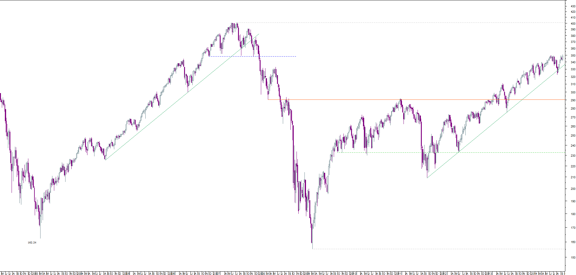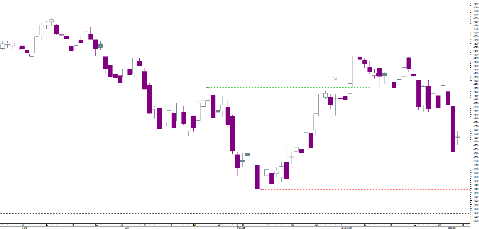 no CAC 40 continua tudo na mesma: após fazer um higher high, aguardo por um higher low, seguido de novo higher high para poder declarar a tendência descendente nascida em junho invertida