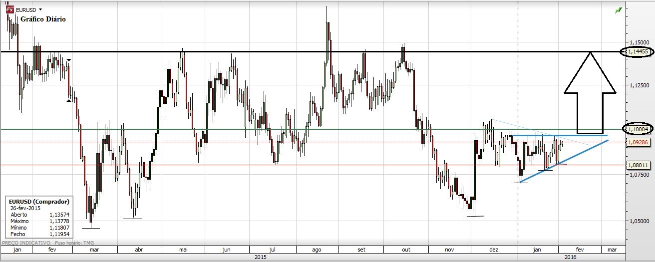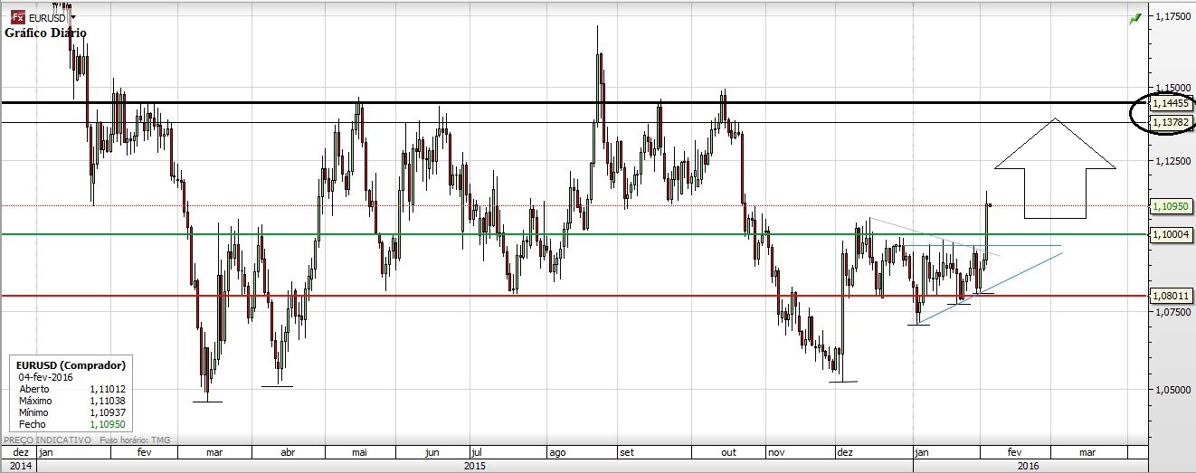 O EUR/USD tem uma curiosidade: ao longo do mês "tentou" sem êxito chegar a 1.10 - andou perto mas não tocou. Ocorreu várias vezes, a última das quais ontem mesmo.