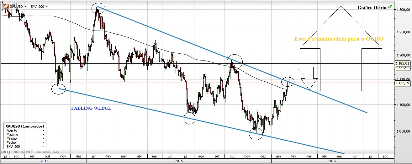 O Ouro, quebrou em alta e em força a Falling Wedge. A vela do Gráfico Semanal é clara assim como as do Diário.