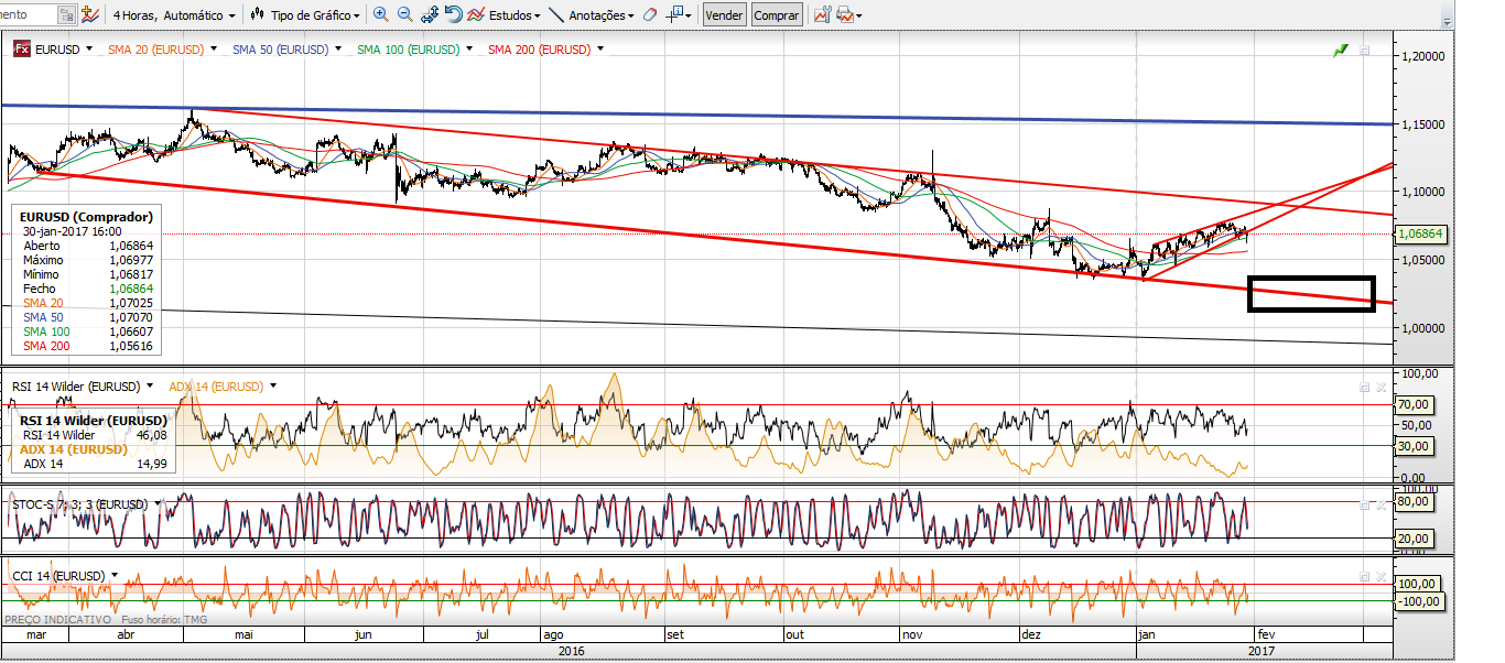 Recebi isto. Concordo com a zona de suporte. Concordo que ainda não partiu o suporte principal, mas sei que este pode partir com a instabilidade trumpiana. No entanto, estou firme com a AT, ou seja, continuo a achar que o caminho do dólar é para cima. A minha maquineta também, apesar da tendência negativa que "ela" interpreta para o EURUSD estar por um fio...