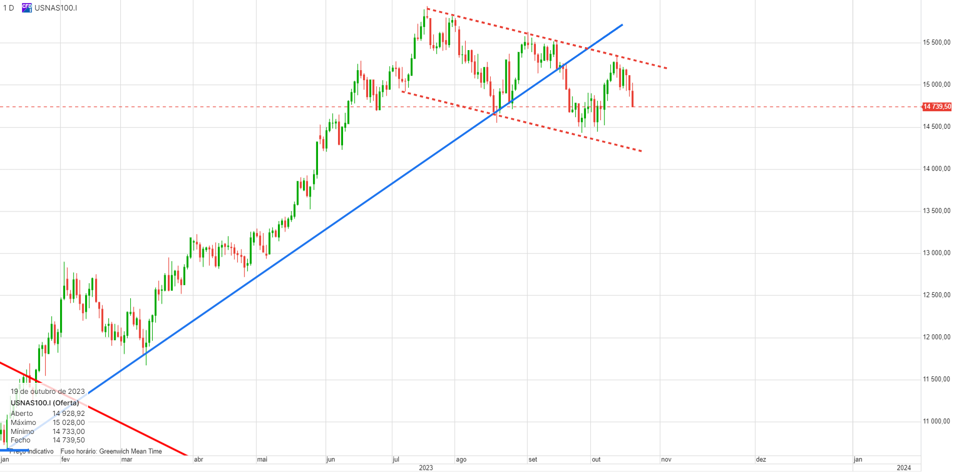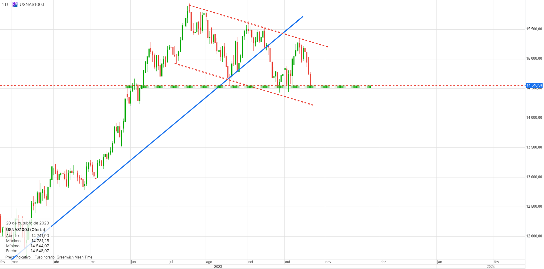 Máximos históricos, em 2021, canal descendente até final de 2022, duplo fundo, quebra em alta do canal descendente, subida de 1 ano, bandeira de consolidação durante 3 meses e aí vamos nós...