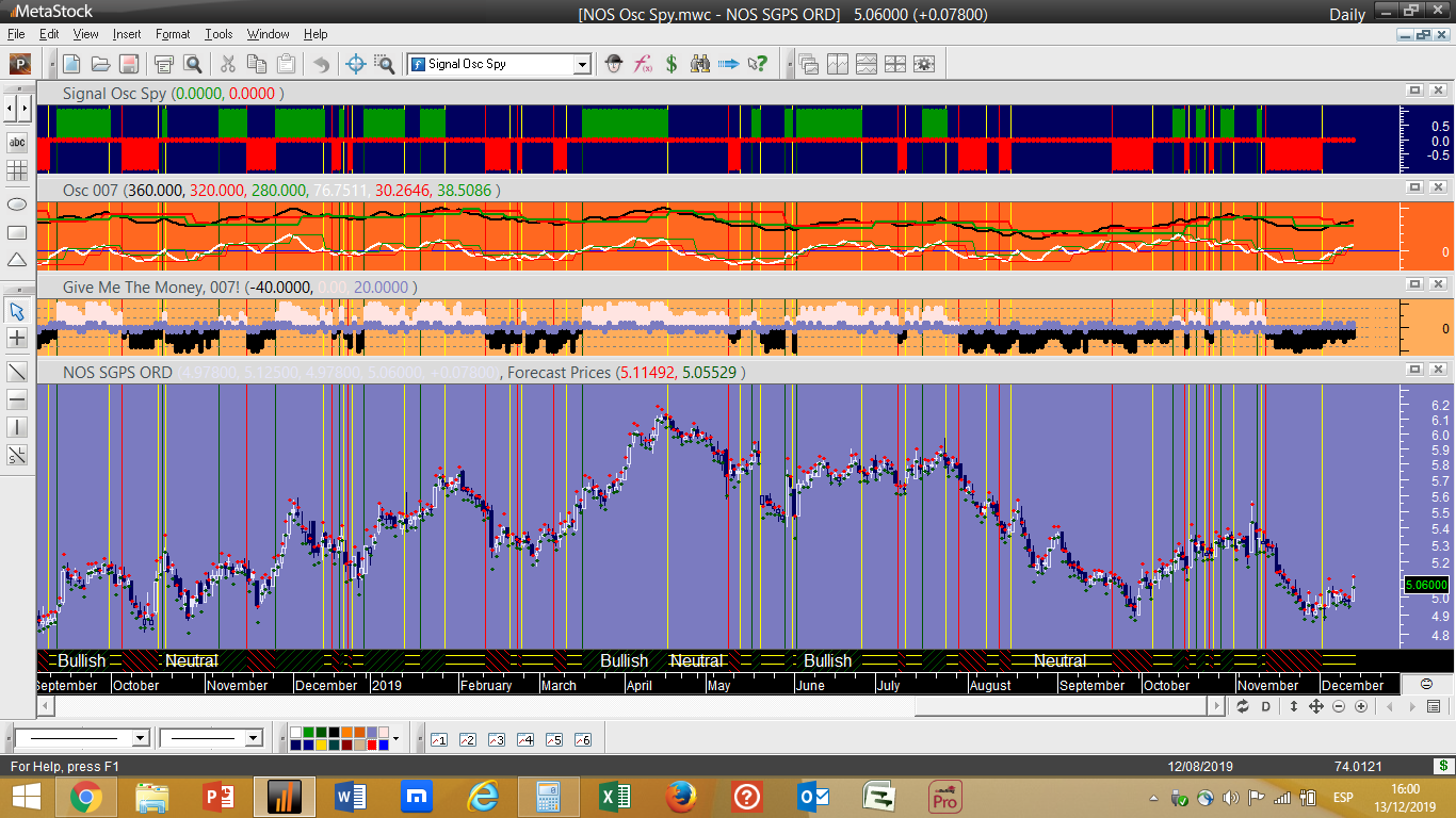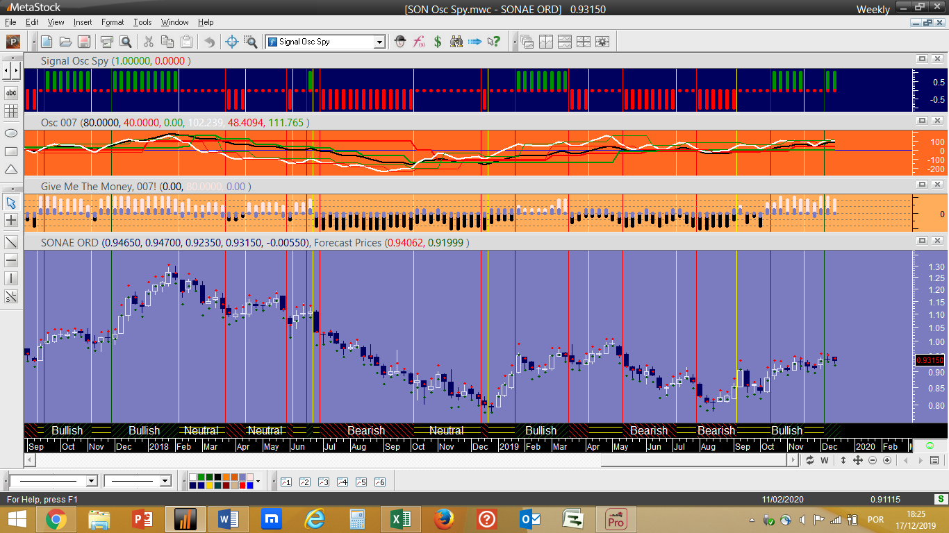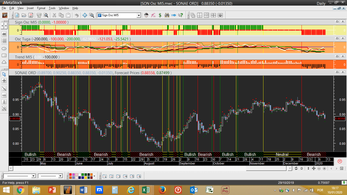 Estando o ciclo e a tendência semanais na mesma fase ascendentes, a compra tem de ser igualmente comprovada na escala diária. Na verdade se fossemos ao gráfico diário, ver também mais abaixo, verificaríamos que também o ciclo e a tendência dominantes (neste caso com a barra branca ascendente a assinalar subidas desde 9 de outubro) se encontram virados para cima, pelo que se pode concluir que a SIEG é papel para continuar a manter com alguma segurança em carteira.