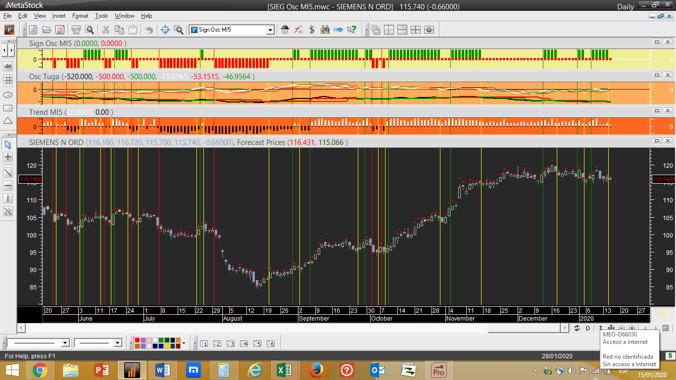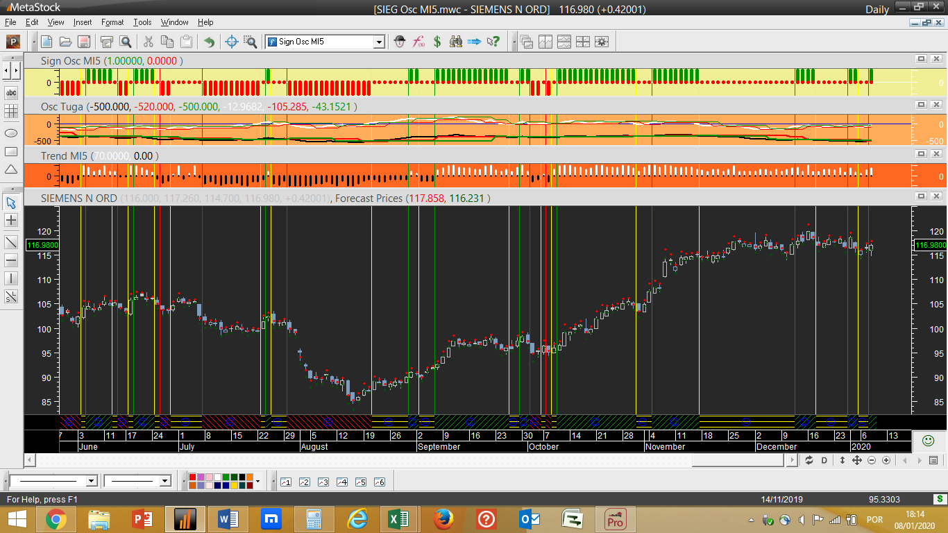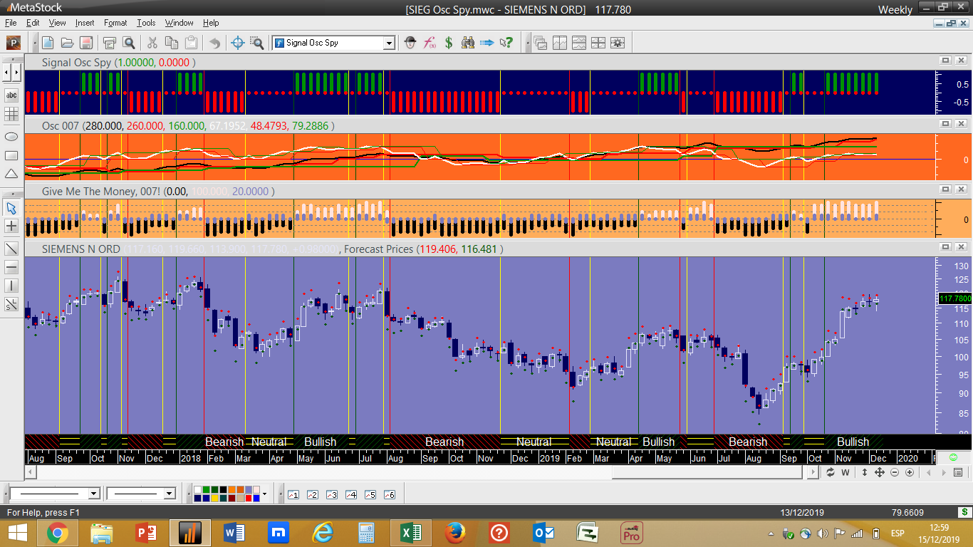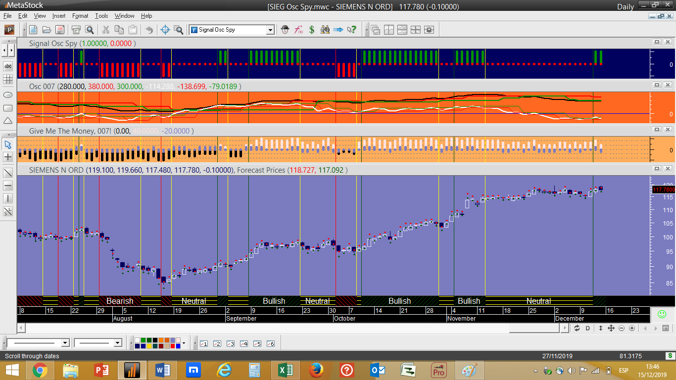 No gráfico semanal do sistema de trading pode-se observar que o último sinal de compra da SIEG, distinguível através da primeira barra verde do gráfico superior, disparou a compra em 1 de novembro passado aos 104,00 € na abertura. O sinal do ciclo semanal ascendente manteve-se até hoje numa altura em que a cotação vai seguindo nos 117,78 €.