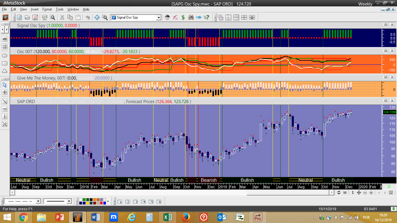 No dia de hoje deixo ficar o gráfico semanal de uma das ações com sinal comprado do Euro Stoxx 50 com tendências e ciclos ascendentes em ambas as escalas temporais, a SAP. No referido gráfico semanal a última tendência positiva (cor branca no 3º indicador a contar de cima) foi disparada em 18 de janeiro do corrente ano e o último ciclo positivo data de 11 de outubro.