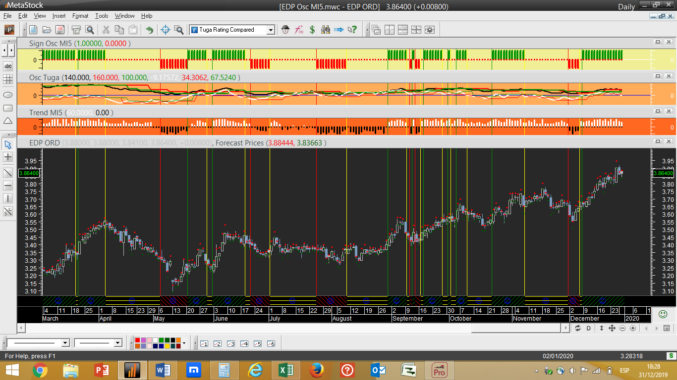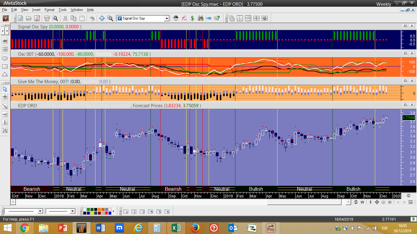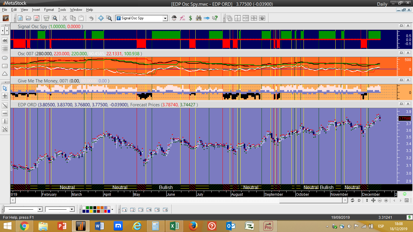A escolha do dia recai hoje na EDP: tendências positivas em ambas as escalas e sentido ascendente no ciclo do gráfico diário são constatações suficientes para manter a EDP com sinal comprado, como se constatam nos gráficos abaixo da elétrica portuguesa.