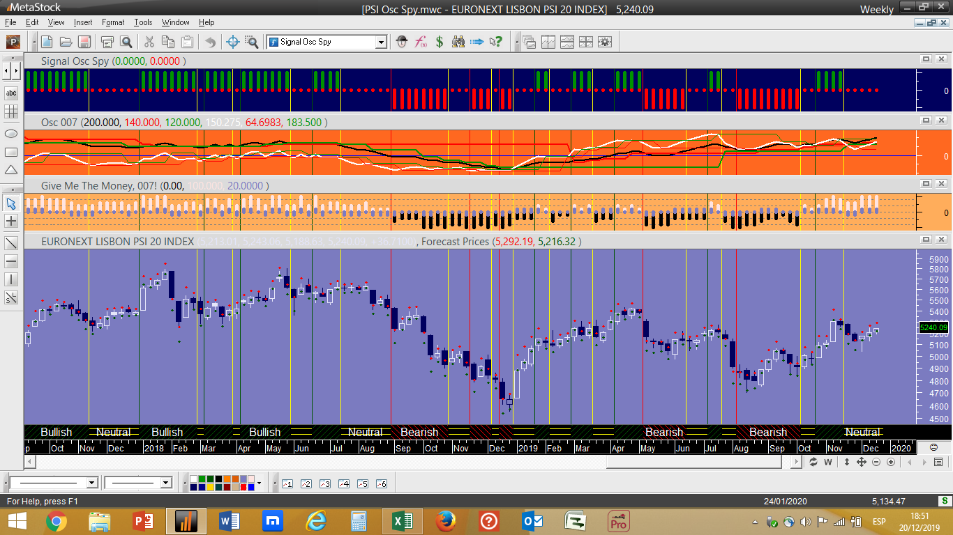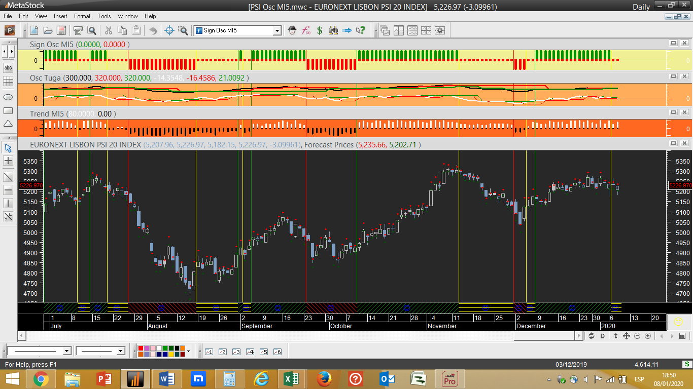 Os gráficos de hoje são do PSI: para já com claro sinal de compra através da conjugação das tendências ascendentes (barras brancas no 3. quadro) em ambas as escalas e ciclo igualmente em fase ascendente no gráfico diário desde 9 de dezembro.