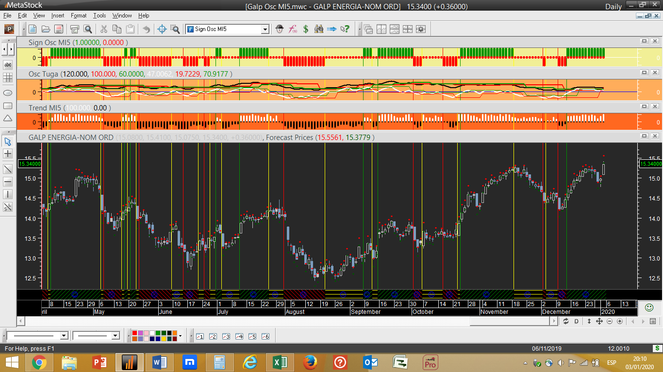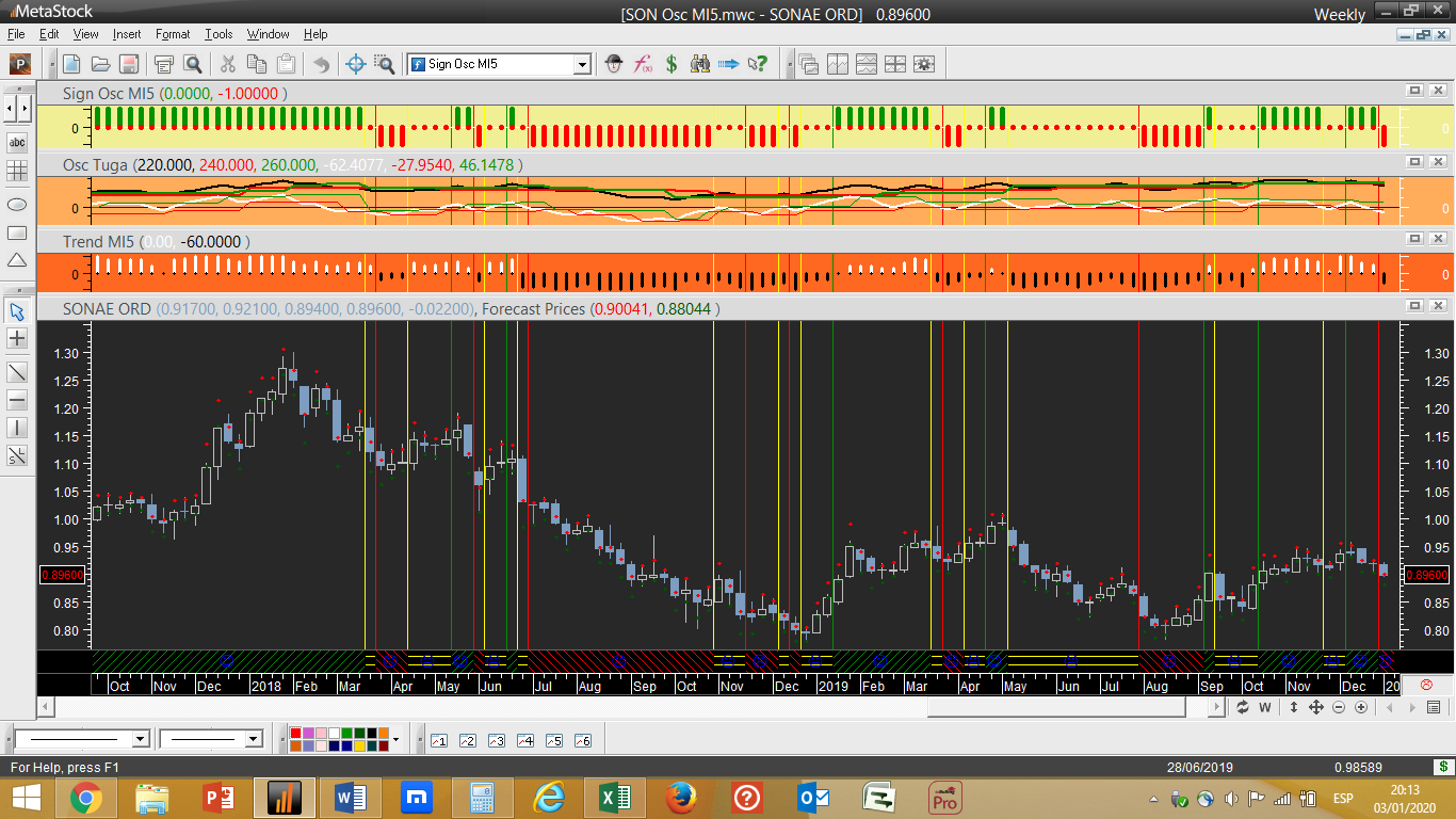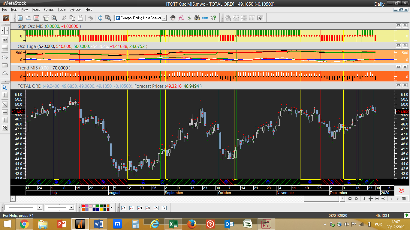 Nas diferentes camadas de indicadores do sistema de trading podemos constatar a partir de cima: sinal de compra (verde) na componente dum ciclo ascendente, os indicadores em fundo laranja são algo secundários para o caso mas confirmam o ciclo ascendente semanal e no 3º quadro o indicador de barras branco confirma a tendência ascencional.