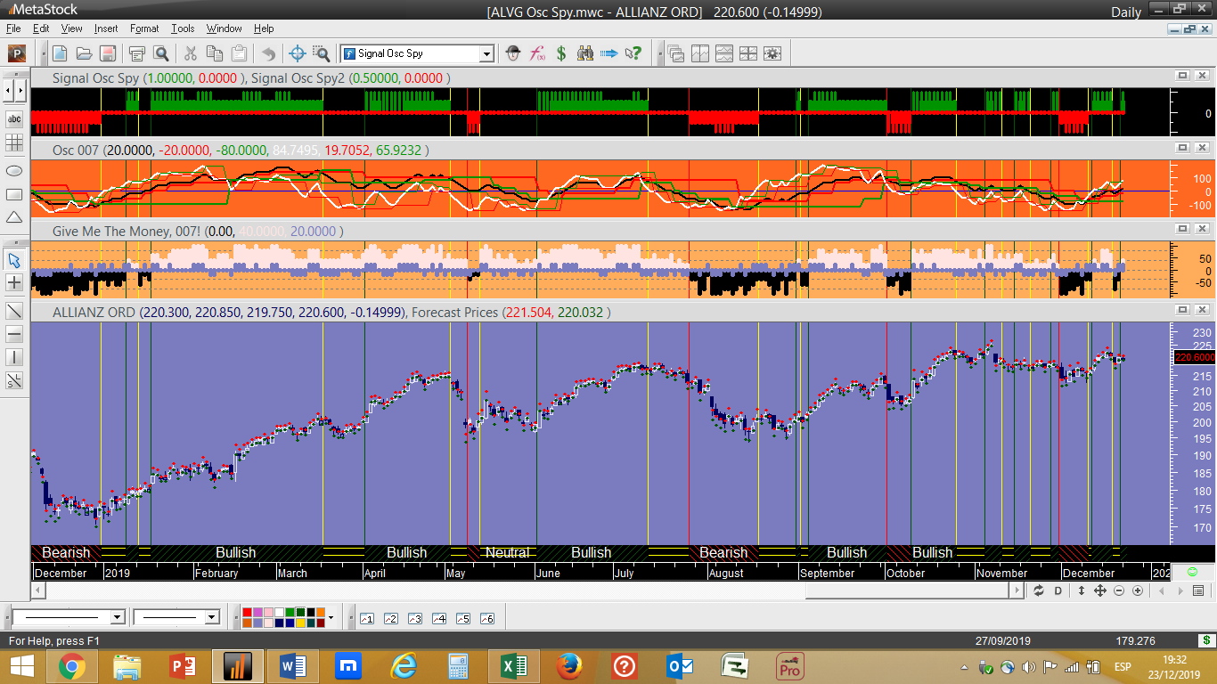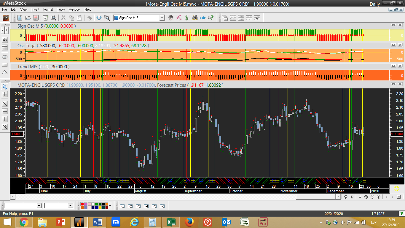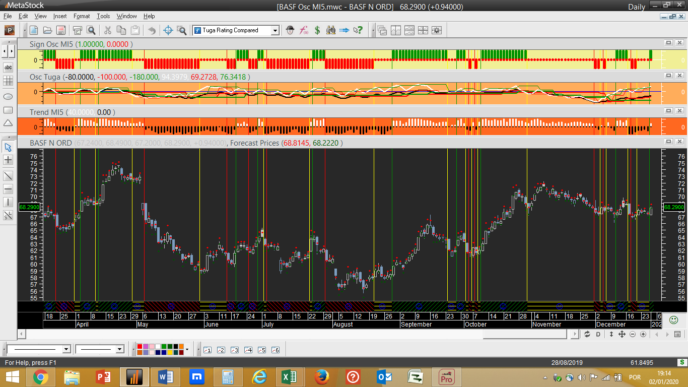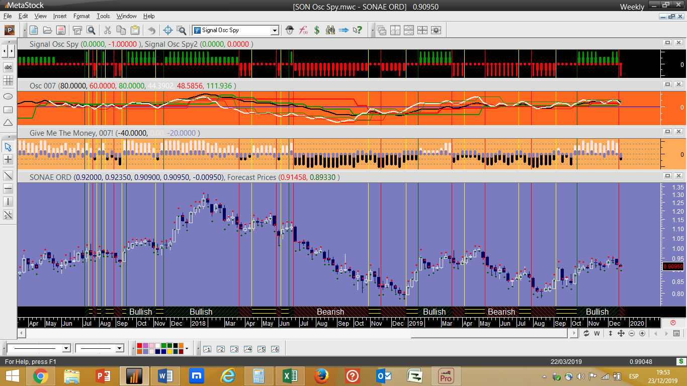 Nas diferentes camadas de indicadores do sistema de trading podemos constatar a partir de cima: sinal de compra (verde) na componente dum ciclo ascendente, os indicadores em fundo laranja são algo secundários para o caso mas confirmam o ciclo ascendente semanal e no 3º quadro o indicador de barras branco confirma a tendência ascencional.