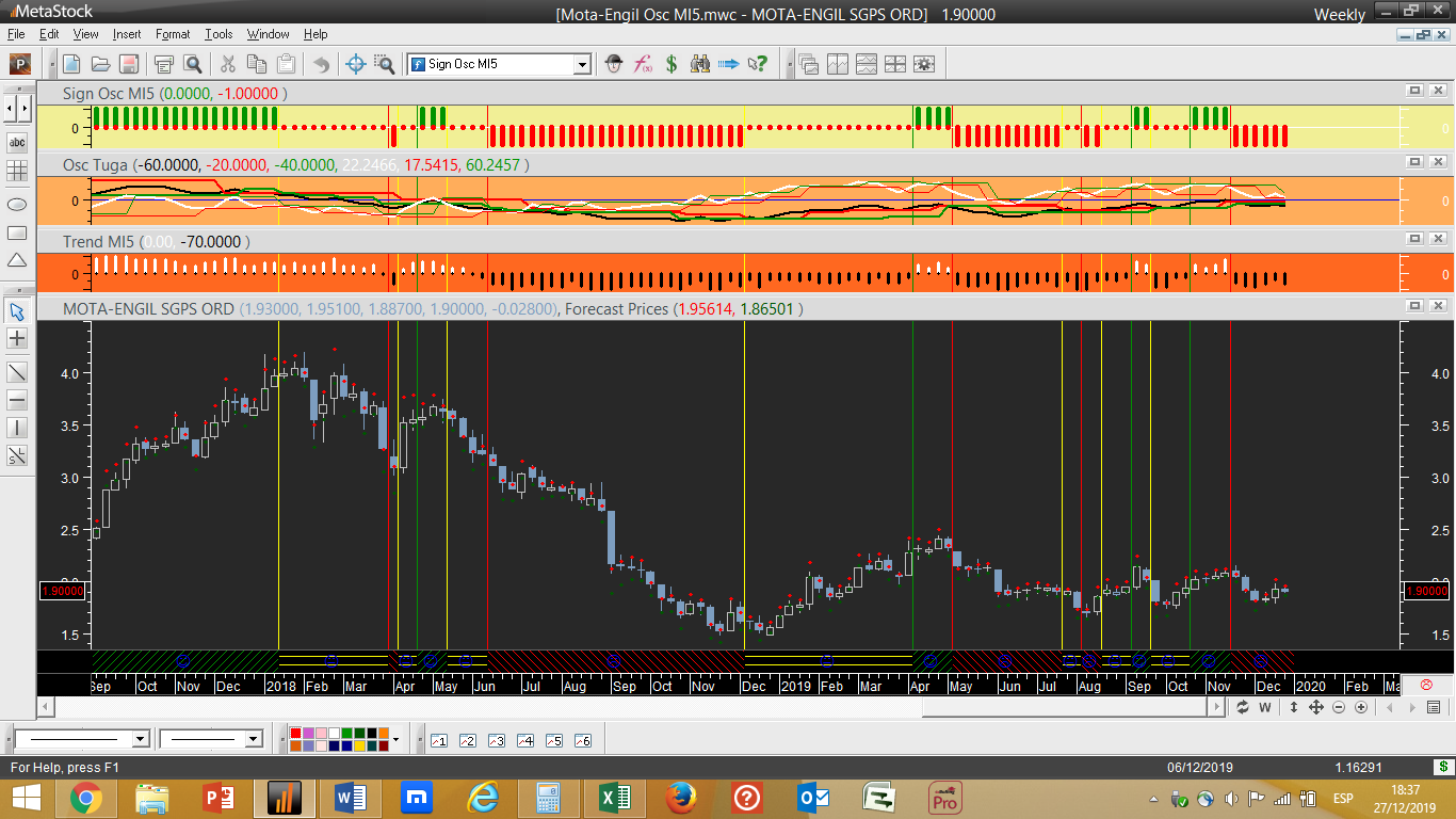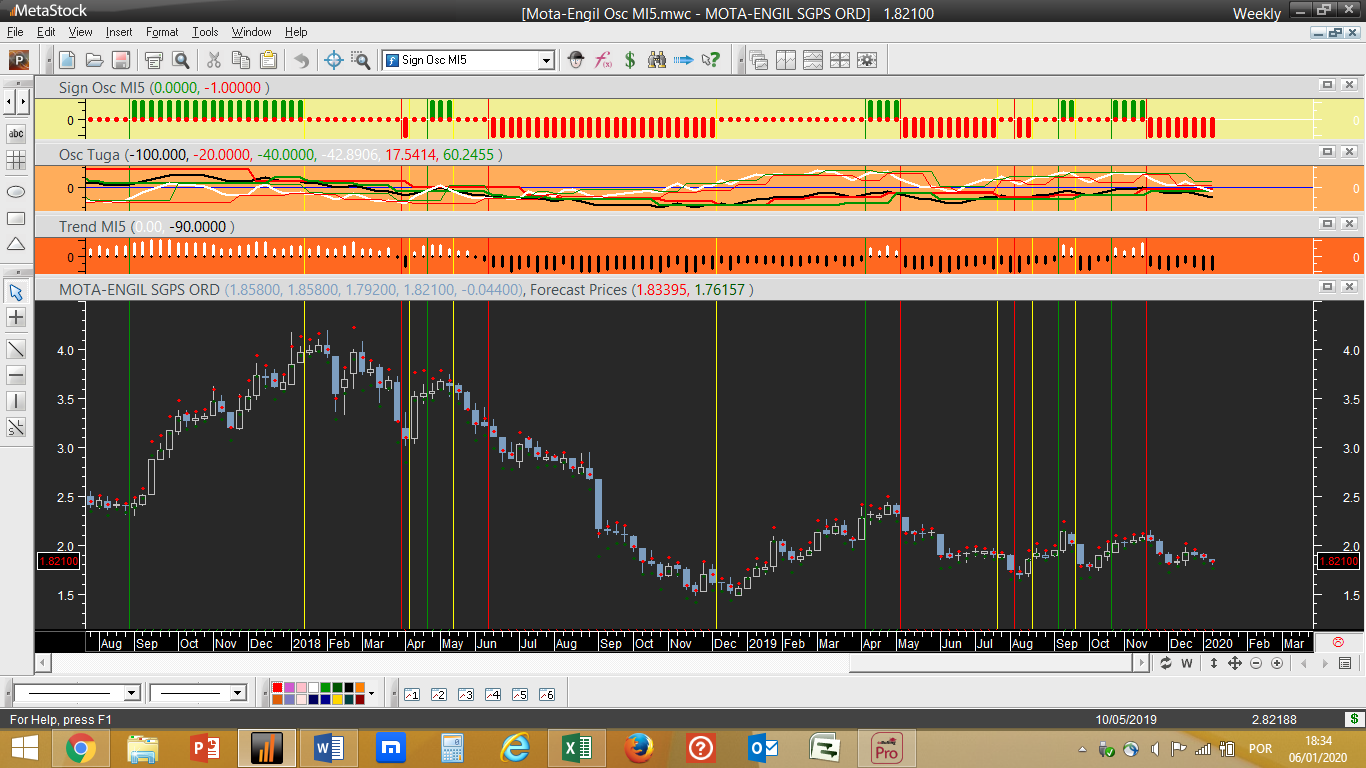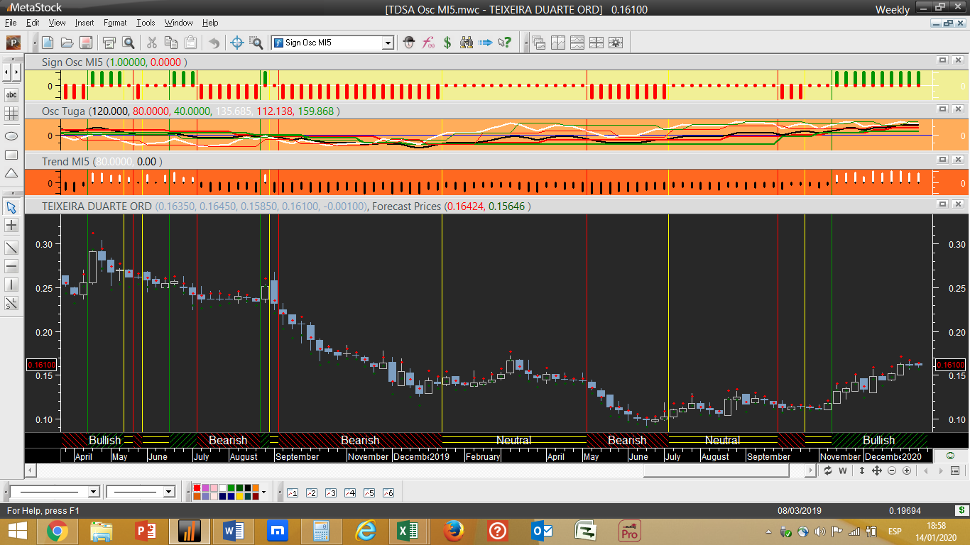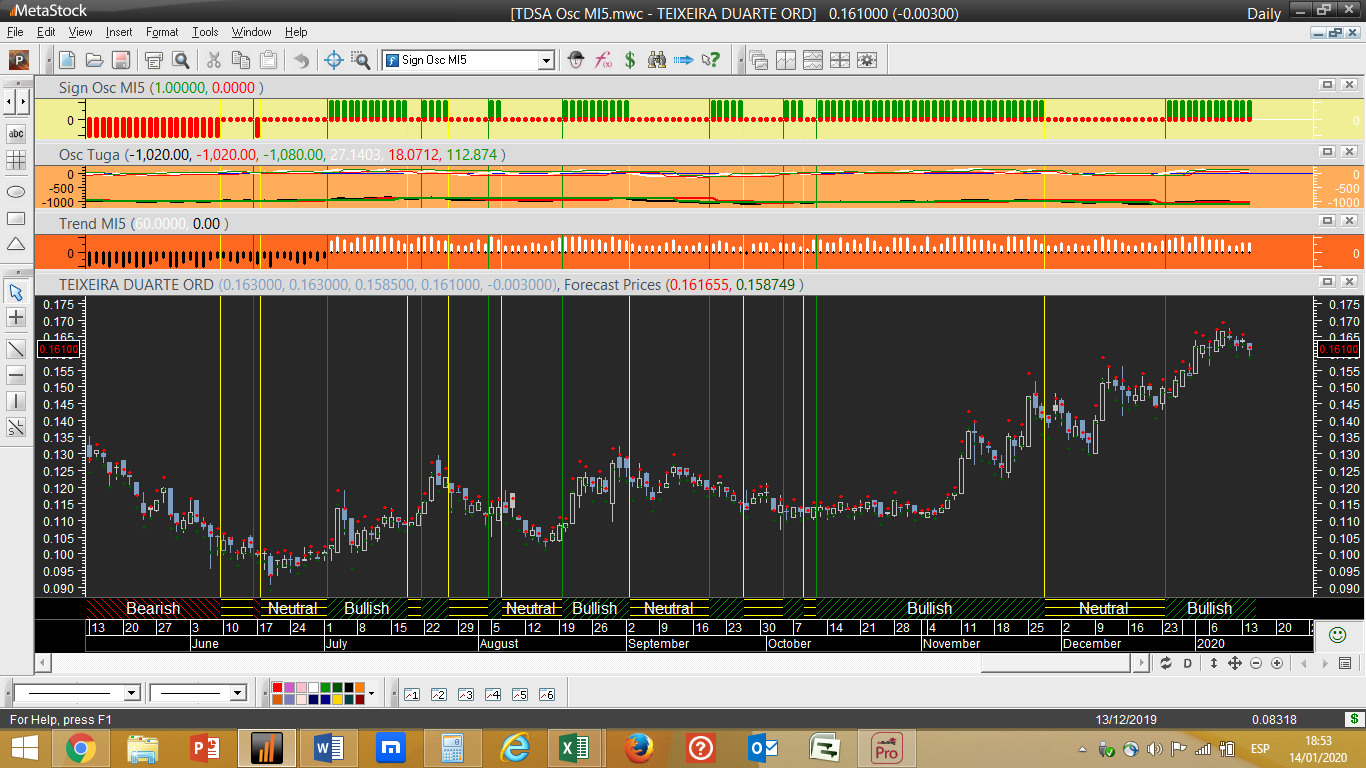 Os 2º e 3º gráficos do dia pertencem a um papel que não faz parte da carteira, a Teixeira Duarte, por motivos da fraca liquidez do papel. Contudo são de registar as indicações bem positivas do sistema de trading, com sinais de compras claras visíveis que se mantêm desde o ano passado, com tendências ascendentes que ainda vigoram até hoje. Ver neste particular as barras brancas do 3º indicador de cima, desde 2 de julho de 2019 na escala diária e desde 15 de novembro na escala semanal.
