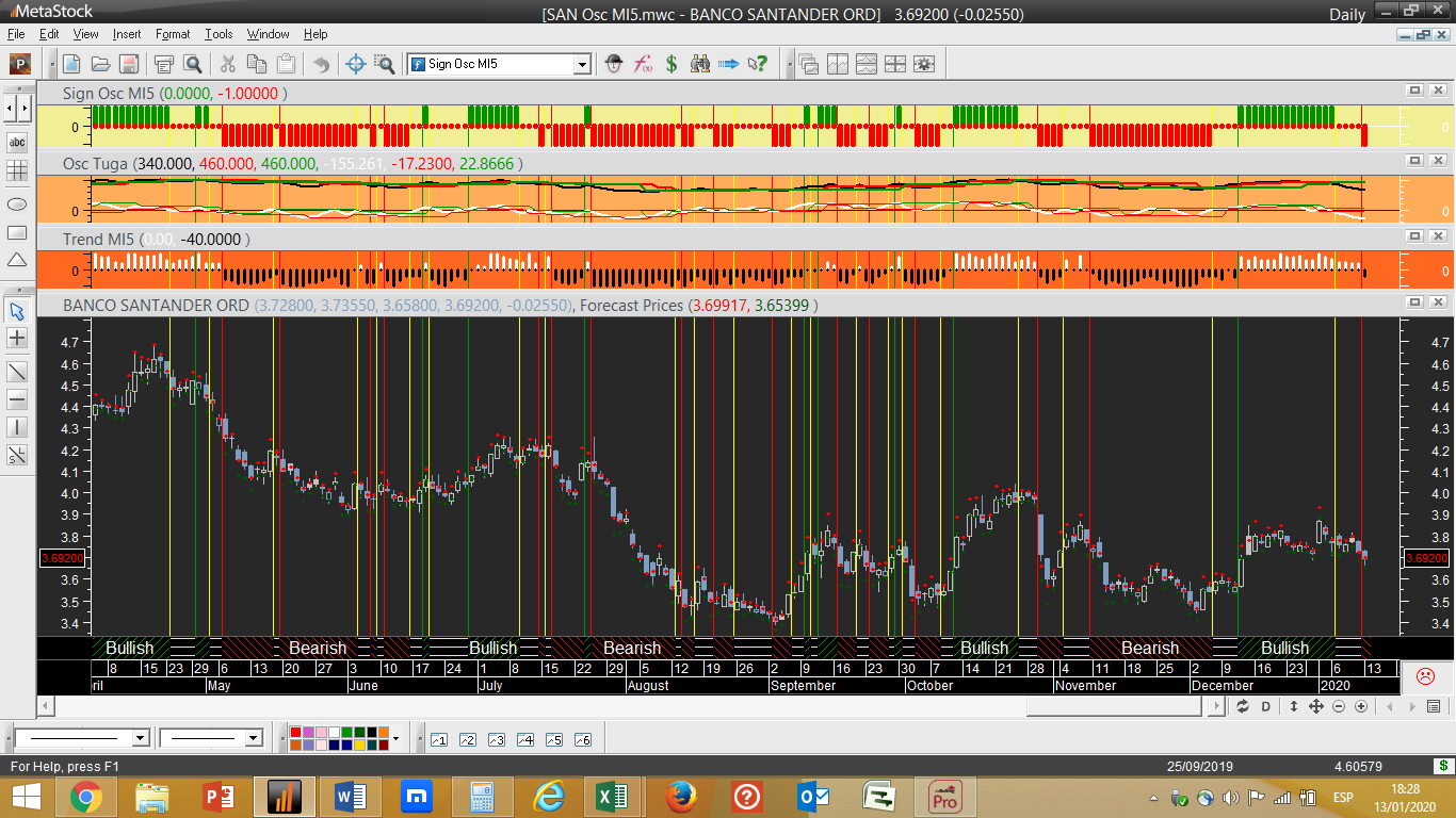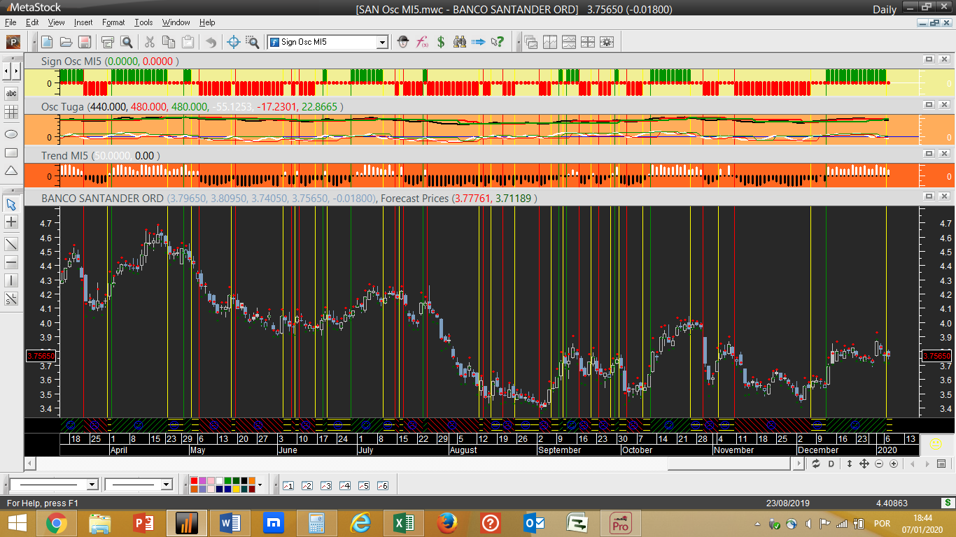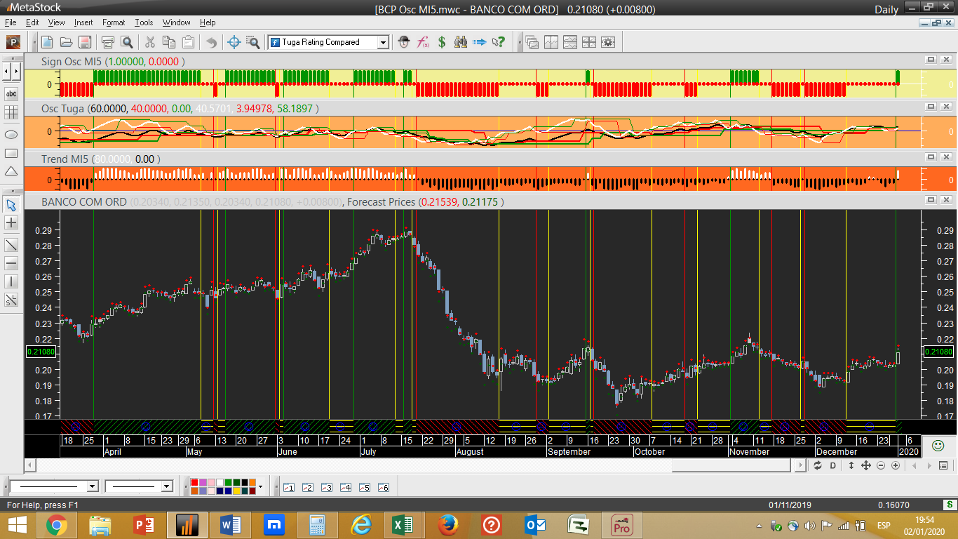 Nota: Entretanto creio ter desenvolvido uma versão mais eficaz do sistema de trading, pelo que porventura a partir do próximo post não estranhem se houver pequenas alterações nos quadros de cima dos indicadores de ciclo. Em vez de existir apenas um indicador, haverá dois indicadores: um que seria o atual indicador dos gráficos anteriores e outro um pouco mais lento, a inserir no mesmo quadro, mas simultaneamente mais estável porque não provoca tantas saídas e entradas no mesmo papel. Esta pequena alteração não provoca para já qualquer mudança nas posições atuais.