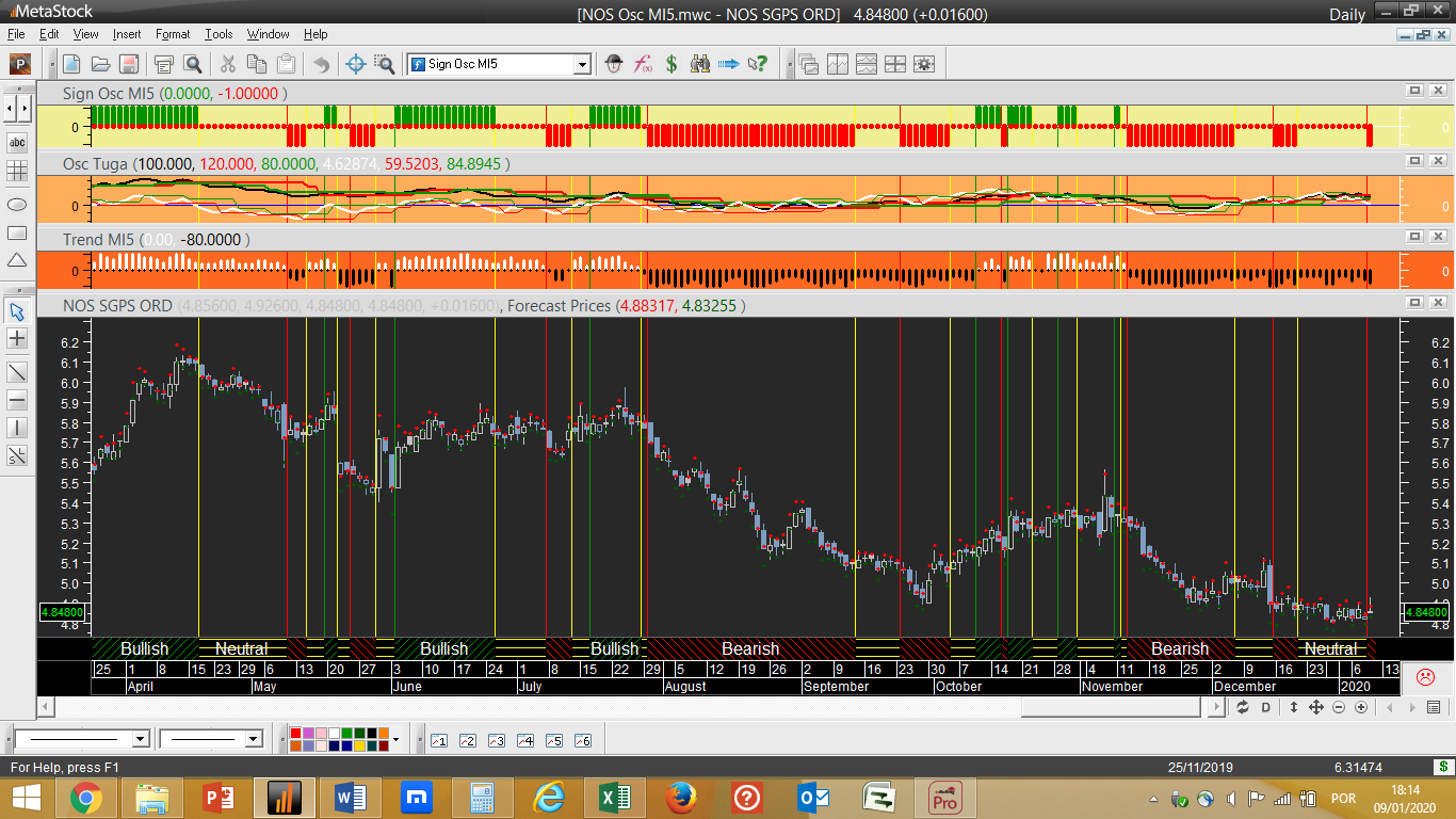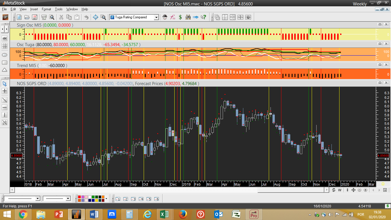 Atualmente, apesar do otimismo geral reinante nos mercados acionistas, a NOS possui tendência descendente nos gráficos diário e semanal e o ciclo encontra-se neutral no diário e descendente no período semanal.