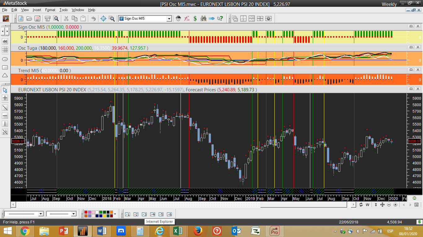 Os 2º e 3º gráficos abaixo são os do PSI nas escalas diária e semanal respetivamente. A curiosidade reside no facto de termos desde ontem o ciclo de trading dominante terminado no sentido ascendente no gráfico diário, através das barras verdes do indicador de cima terem terminado. No entanto as regras indicam que nesse caso a posição comprada no índice se deverá manter caso a tendência da mesma escala se mantenha positiva, o que se verifica no 3º indicador de cima “Trend MI5” com as barras a mostrar a cor branca ascendente, e o ciclo de trading e a tendência continuem ascendentes na escala semanal, o que se confirma no 3º gráfico de baixo que representa o PSI semanal. So, stay long!