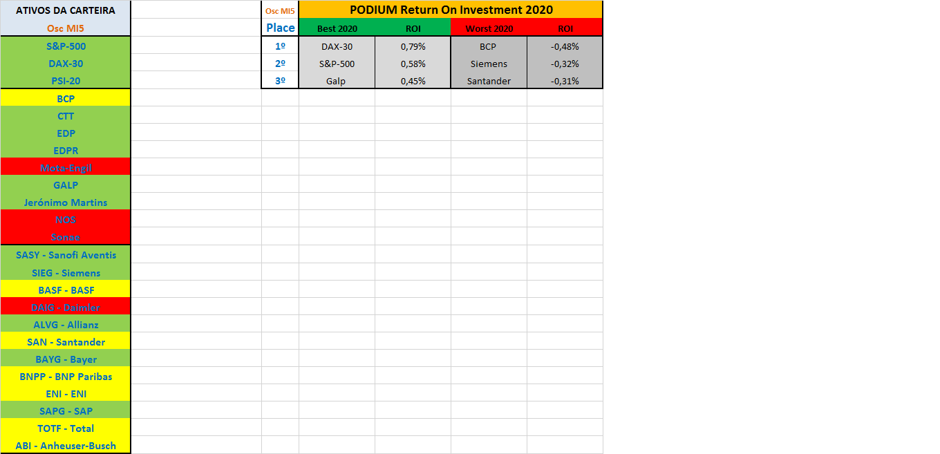 Para efeito dos valores da rentabilidade ou retorno acumulados os ROI (Return On Investment) serão tomados em relação aos últimos valores de fecho de 2019. Hesitei se deveria ou não referir os valores totais e concluí por um meio termo, referindo apenas os valores acumulados dos 3 melhores e 3 piores papéis de 2020 no final de cada semana. A ver se não sai barraca, wish me luck!