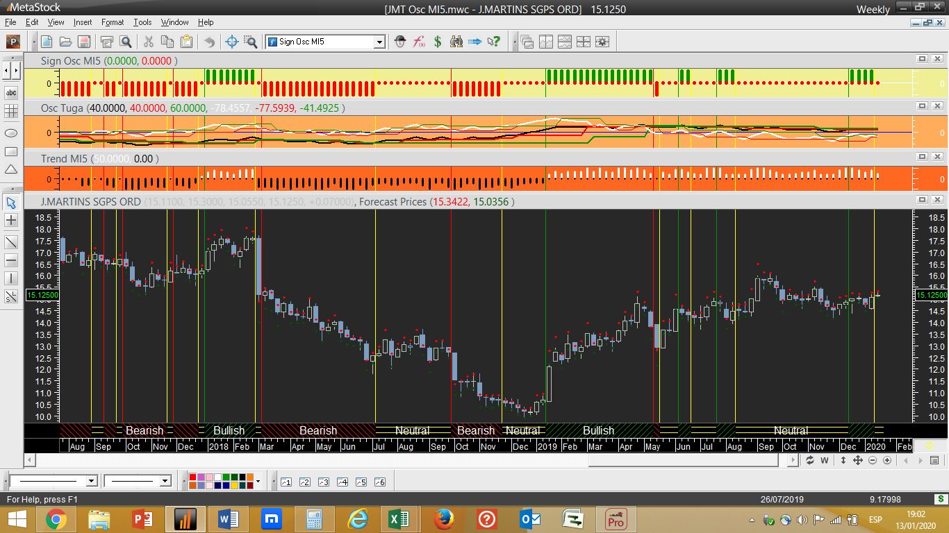 Jerónimo Martins - Possibilidade de passar de comprada a neutral, a confirmar no final da semana. Ver 1º gráfico abaixo.