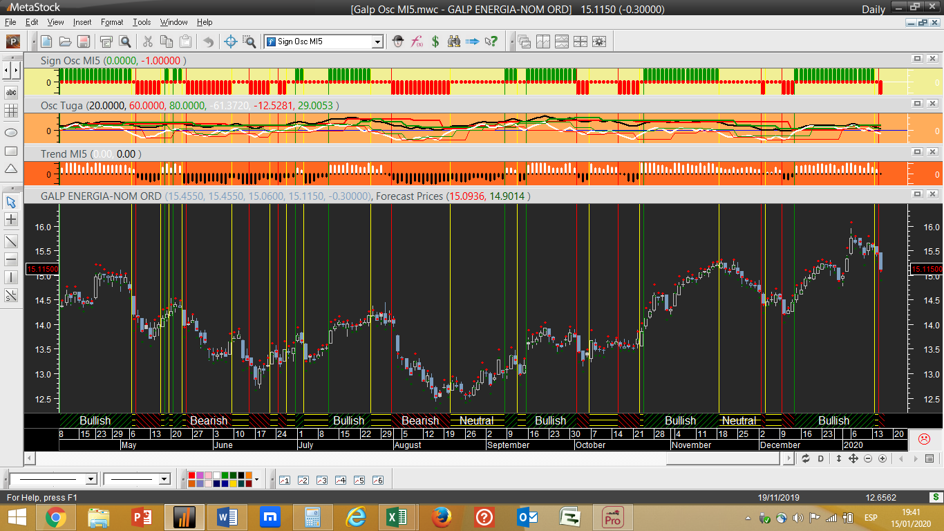 Galp – Encontrava-se neutral no sistema de trading, ativou uma possível compra que só poderá ser confirmada no final da semana por eventual mudança de sinal da tendência semanal (a semana da vela só termina na 6ª feira).