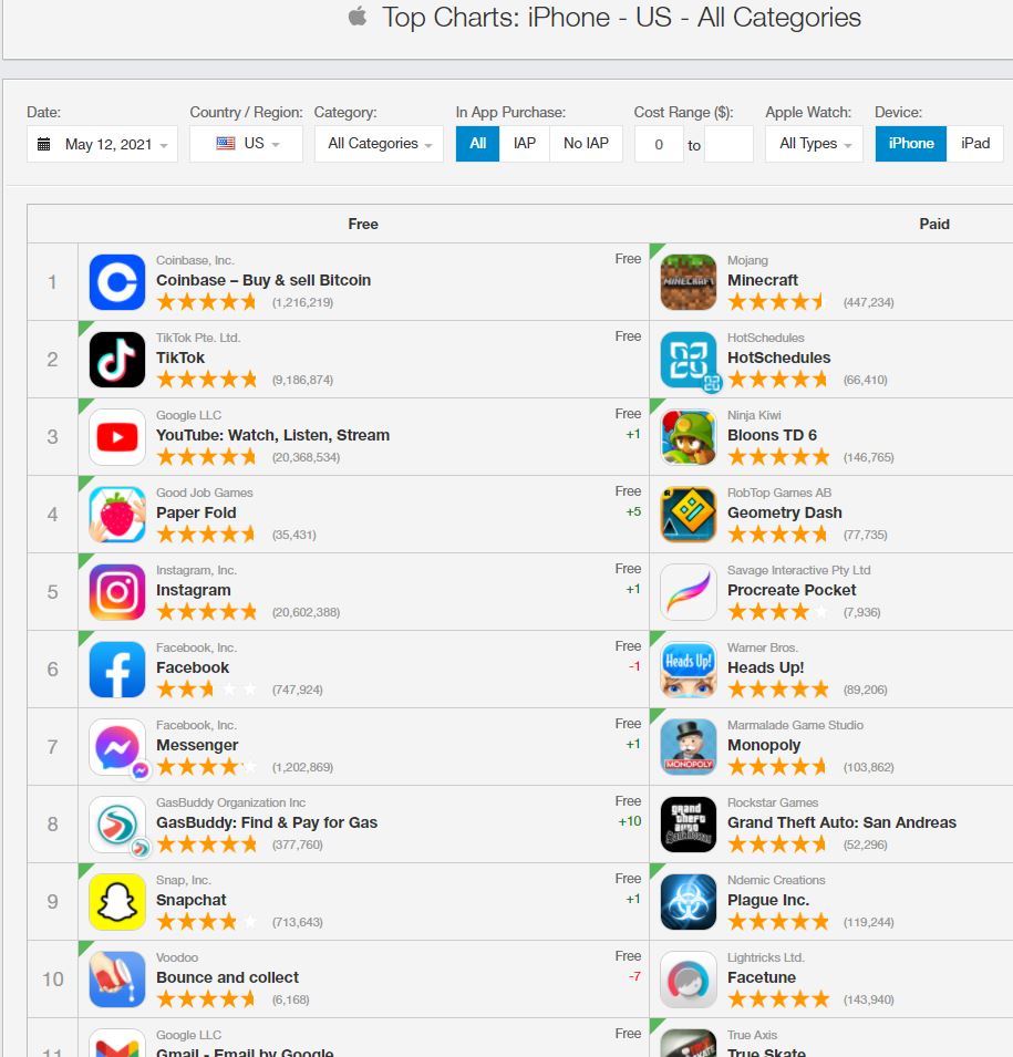 According to the Top Charts list on the Apple App Store, Coinbase is currently the most popular app in the United States, ahead of TikTok, YouTube, Facebook, Instagram, and trading app Robinhood. Cash App, which allows users to send money and buy Bitcoin (BTC), sits in the #12 position at the time of publication, while Binance’s and Trust’s apps are at #16 and #17, respectively.