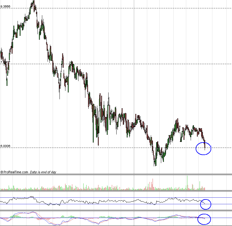 Além do elevado potencial desta acção uma vez que ainda se encontra nos seus minimos históricos, a acção prepara-se na minha opinião para quebrar a Ltd de curto prazo (o que poderemos confirmar na próxima semana), o RSI aponta para oversold e tb o MACD parece preparar-se para uma reversão o que me deixa bastante optimista quanto ao comportamento desta acção nos próximos dias.