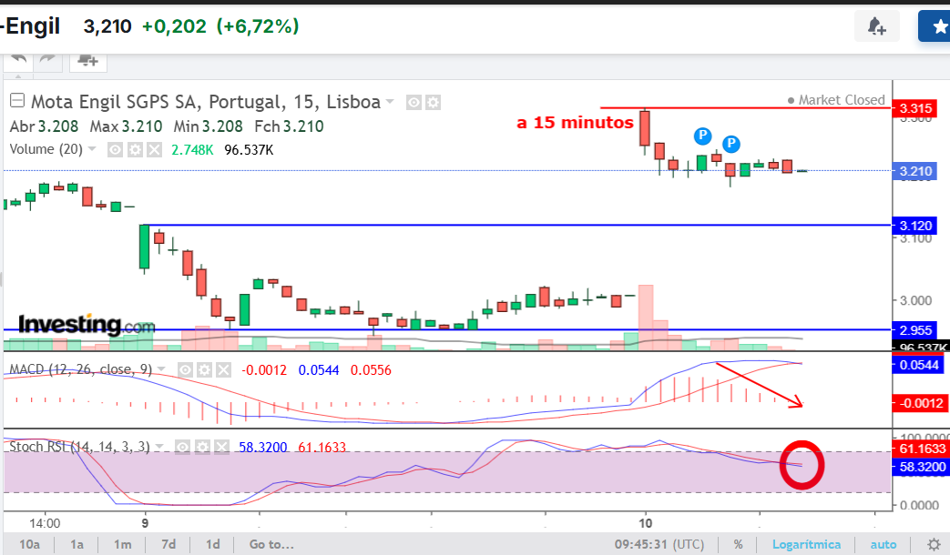 Aqui_Vale Escreveu:tami Escreveu:O senão de tentar apanhar topos e fundos é que agora, quem saiu, não faz a minima ideia se reentra hoje, ou se espera por uma retração para apanhar o melhor preço possível. E tentar adivinhar para onde ela vai nos próximos dias dificilmente se vê num gráfico - que ontem no fim da sessão dizia que o caminho era o apocalipse, nos 2,5€ ou menos; e ao fim da tarde, com o mercado fechado e sem transações, mais facilmente apontava para os 3,5€.