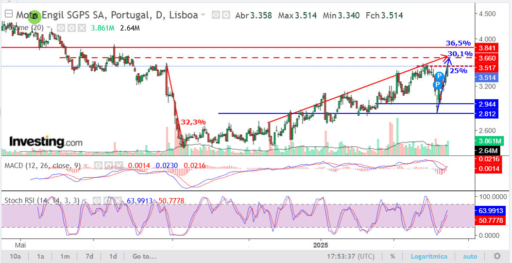 Veio ao suporte horizontal nos 2,80 (muito mais do que esperava...) mas aguentou e já está acima dos 3,30s... Cerca de 20% em 5 sessões. Fenomenal desempenho, quando está bull (ou bear) não há discussões