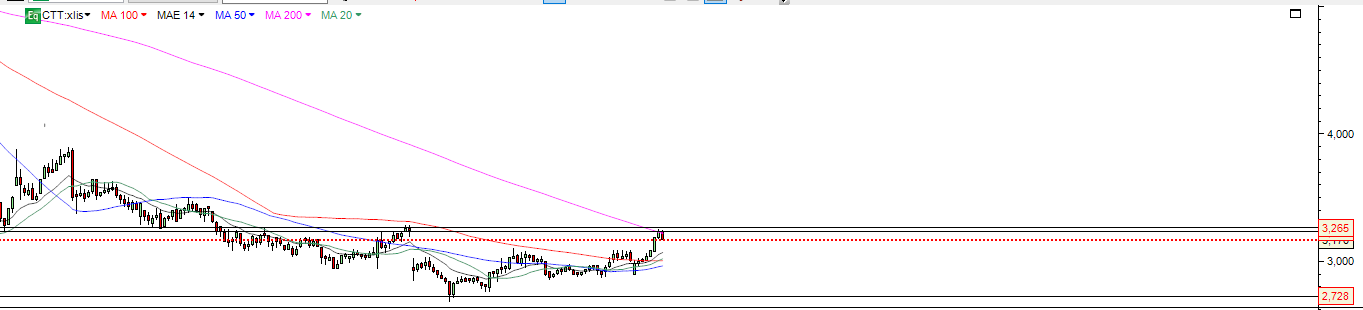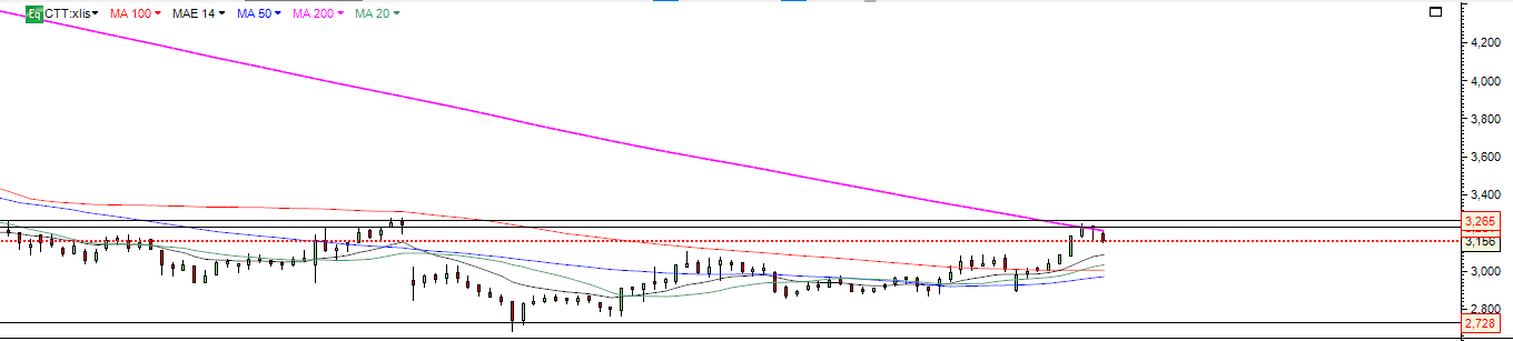 CTT após não ter conseguido ultrapassar a forte resistência e MM200 3.24 -3.26, está a fazer o expectável e recua , estando hoje a 3.11.