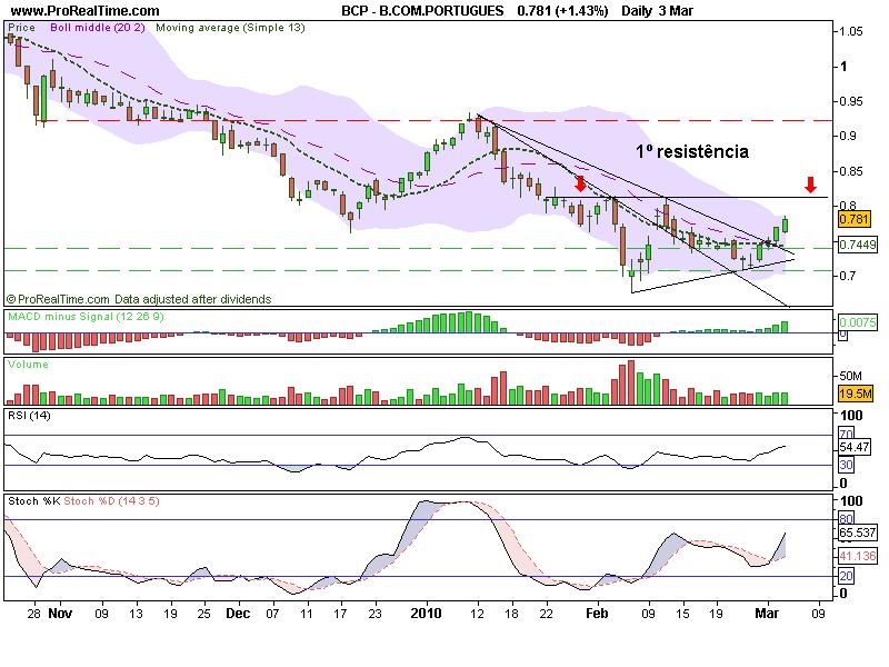 Relativamente ao BCP, e possível continuação de subida, estaremos realmente perante um duplo fundo? será que se aguentará perante os 0,81€? o Stochastic está muito esticado embora o RSI ainda dê folga para mais avanço, estou tentado a entrar, mas não quero levar com uma pranchada e cair na asneira de as estar a comprar no topo de uma subida...uma pequena correcção poderá ser possível,tudo depende da Grécia, e pelo que vejo está a passar a maré negra nos mercados devido a essa preocupação, com eventuais ajudas por parte da Alemanha e da UE...