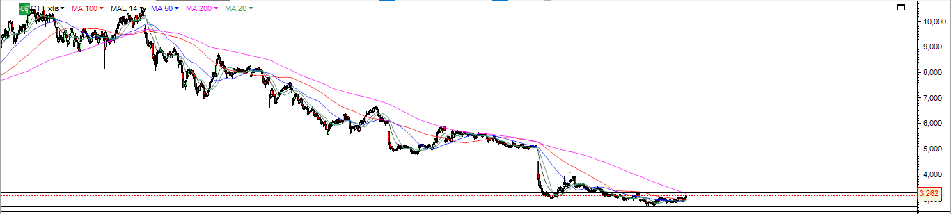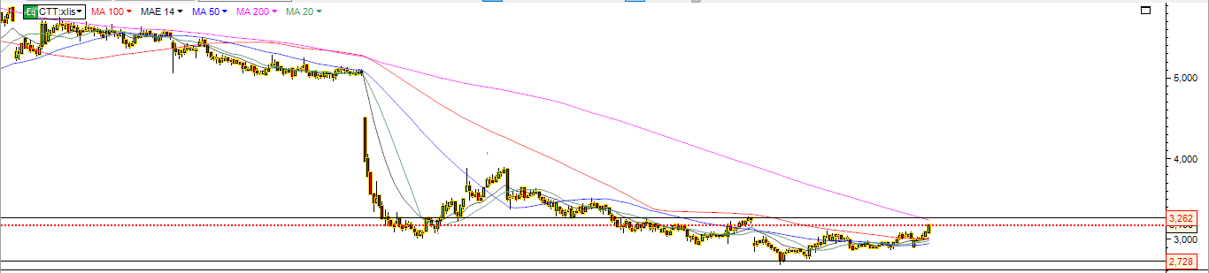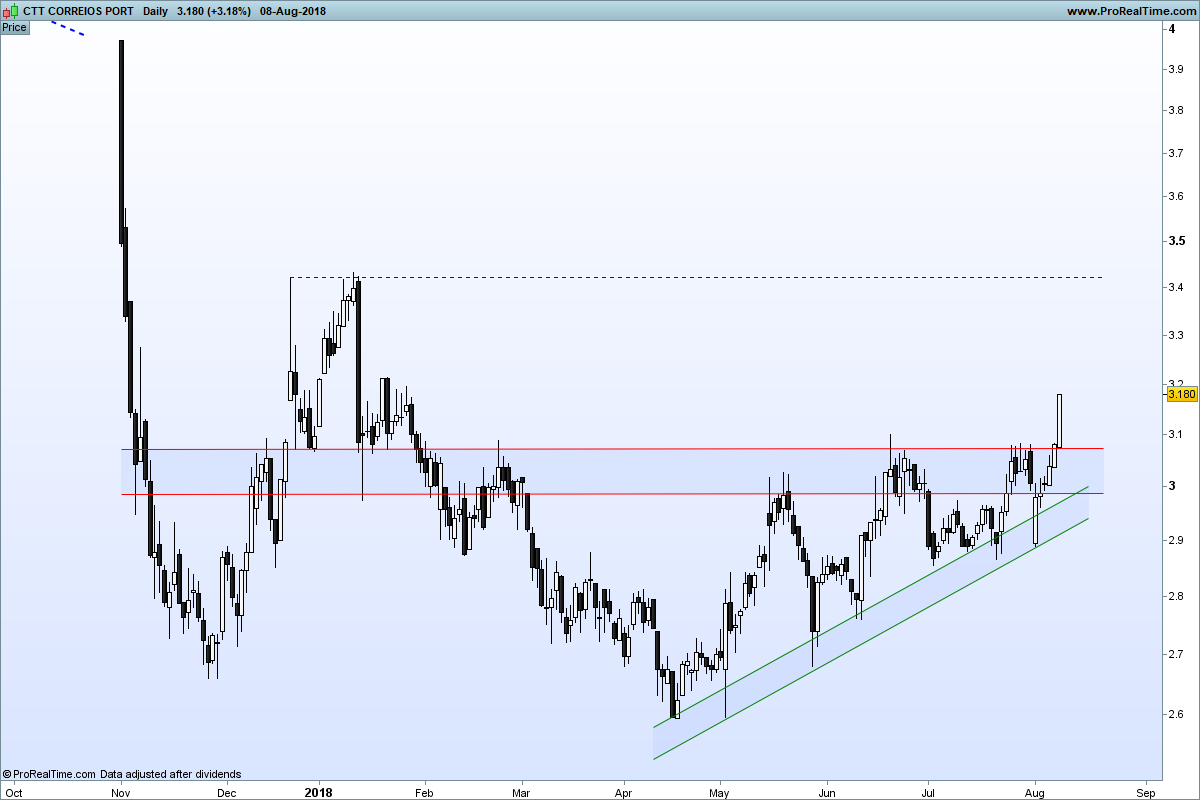 Boas tardes CTT A MOSTRAR força a romper o seu canal descendente de longo prazo dando como primeiro sinal para uma recuperação / consolidação criando o suporte na zona dos 3/3.09 tem como resistencia os 3.27/3.30 mas pelo gráfico em tempo menor activou ontem para essa zona para quem está a entrar agora e pensa para o médio prazo em vejo a zona do gap na zona dos 5.xx como alvo a médio prazo aqui fica o boneco