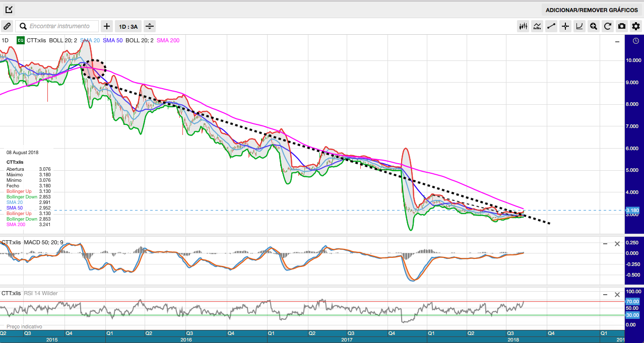 Se no terceiro trimestre de resultados, os curtos não se sentirem pressionados, ou pelos resultados desempenho aí atingido, ou pelo prazo de entrega das acções emprestadas estar a terminar, os CTT poderão conhecer novos mínimos, pois ou muito me engano, ou novembro/dezembro de 2018 vai ser profícuo de bons movimentos de amplitude nas bolsas, com a agravante do OE2019, e negociações subsequentes.