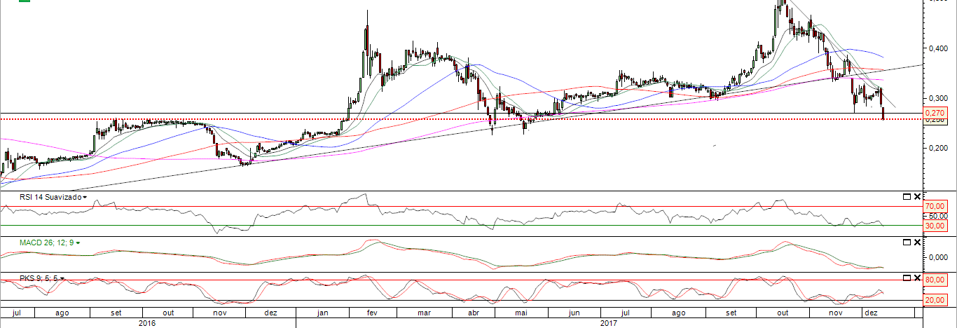 O OBV no diário continua super divergente do preço, oscilador Trix idem etc...É natural que o mercado possa vir nos próximos dias a testar os 0.24-0.25cts![]()